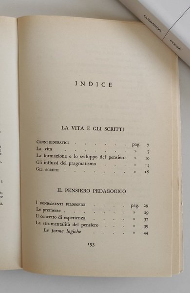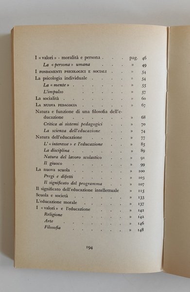 Stato di conservazione: BUONO, ordinario ingiallimento, firma di appartenenza alla sguardia ant., alcune sottolineature a matita (solo fino a pagina 18), legatura leggermente allentata al centro, per il resto in ordine. Collana: Pedagogisti ed educatori. III edizione.