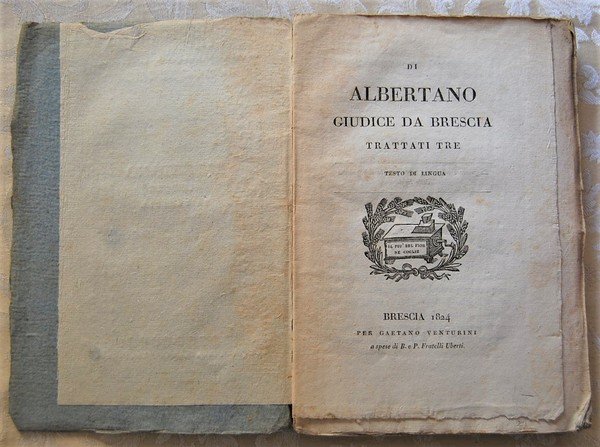 Venturini, 1824. In - 8 p., brossura editoriale (mancanze al dorso), pp. VI,(2),244. Vi sono contenuti: "Il libro dell'amore, e della dilezione di Dio e del prossimo, e dell'altre cose, e della forma dell'onesta vita - Il libro d'Albertano lo quale tratta della consolazione, e de' consigli - Le sei maniere del parlare". Sono famosi trattatelli dell'erudito scrittore duecentesco, Albertano, giudice a Brescia. Cfr. Gamba,25. Intonso. Con lievi fioriture, peraltro ben conservato