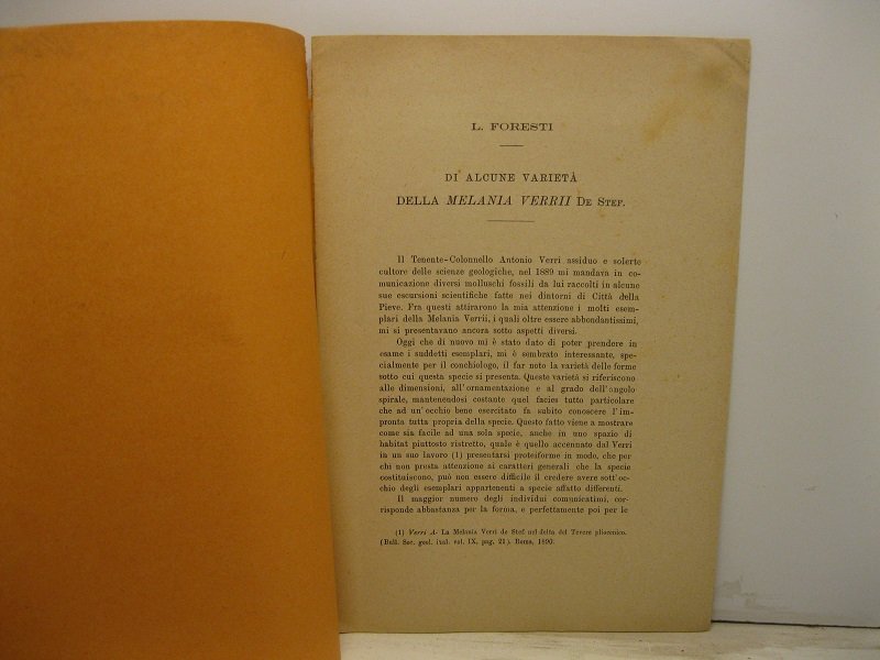 In 8, pp. 74-79 + (2b) con una tav. f.t. Dedica autogr. dell'A. al p. ant. Br. muta coeva. Descrizione di molluschi fossili, fra i quali in particolare molti esemplari della Melania Verrii, ritrovati nei dintorni di Citta' della Pieve.