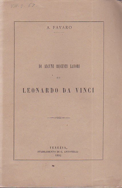 In-8°, pp. 48, brossura editoriale riquadrata. Ottimo stato. Estratto dagli 'Atti del R. Istituto Veneto di Scienze, Lettere ed Arti', tomo III, serie VII. Il Favaro (Padova, 1847-ivi, 1922), celebre matematico e storico della scienza, è noto anche come studioso di Galileo e curatore di un'importante edizione delle sue opere.
