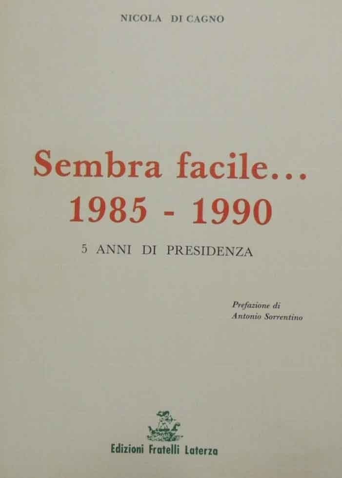 Nicola Di Cagno, Sembra facile. 1985-1990. 5 anni di presidenza, prefazione di Antonio Sorrentino, Edizioni Fratelli Laterza, Bari 1990, pp. 113, ill. col., cm 24, br. ed. Raccolta di lettere e discorsi relativi al quinquennio trascorso da Nicola Di Cagno alla Presidenza del Consiglio regionale della Puglia. Perfetto.