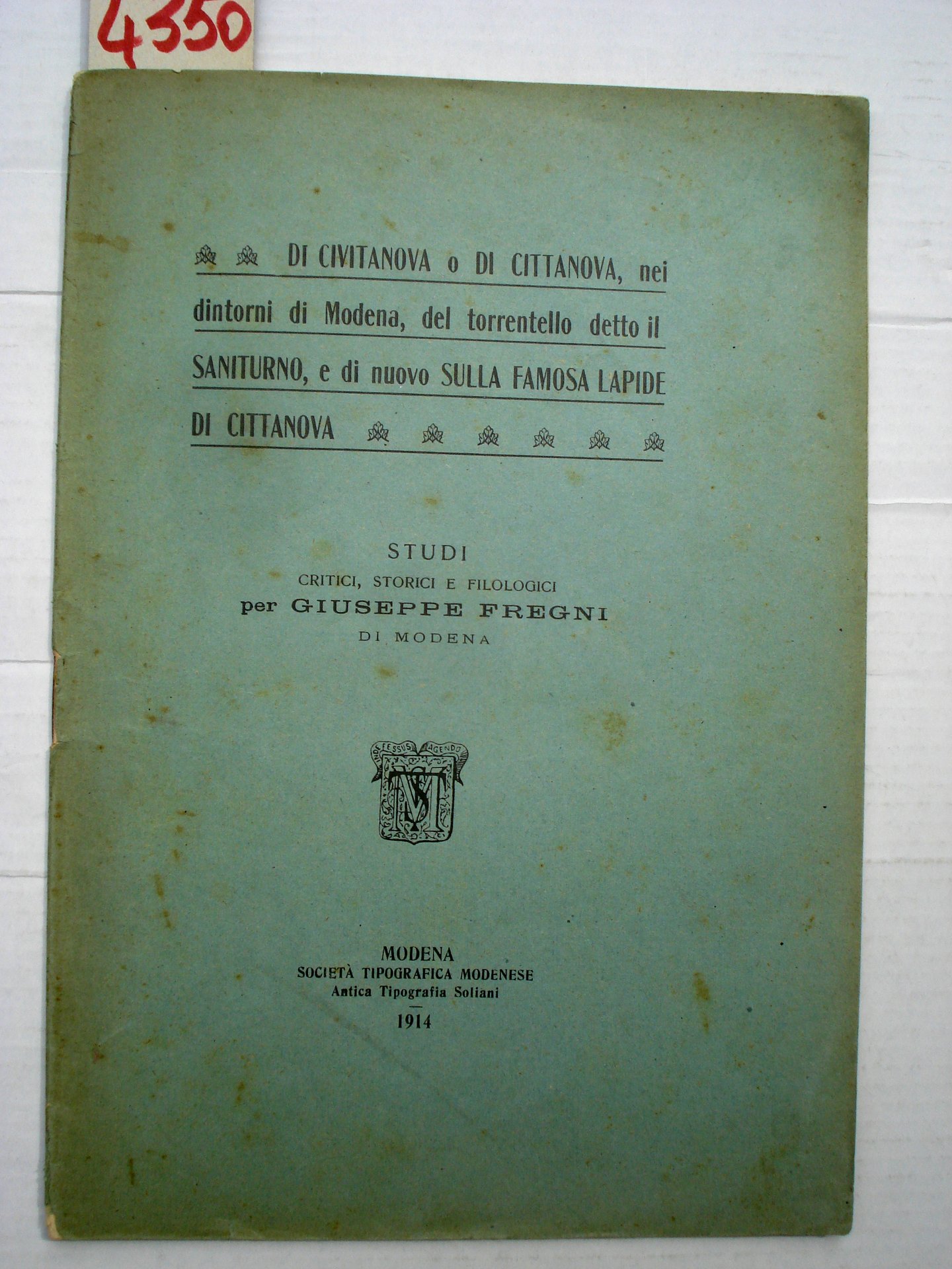 DI CIVITANOVA O DI CITTANOVA, NEI DINTORNI DI MODENA, DEL TORRENTELLO DETTO IL SANITURNO, E DI NUOVO SULLA FAMOSA LAPIDE DI CITTANOVA: STUDI , STORICI E FILOLOGICI per Giuseppe Fregni di Modena.