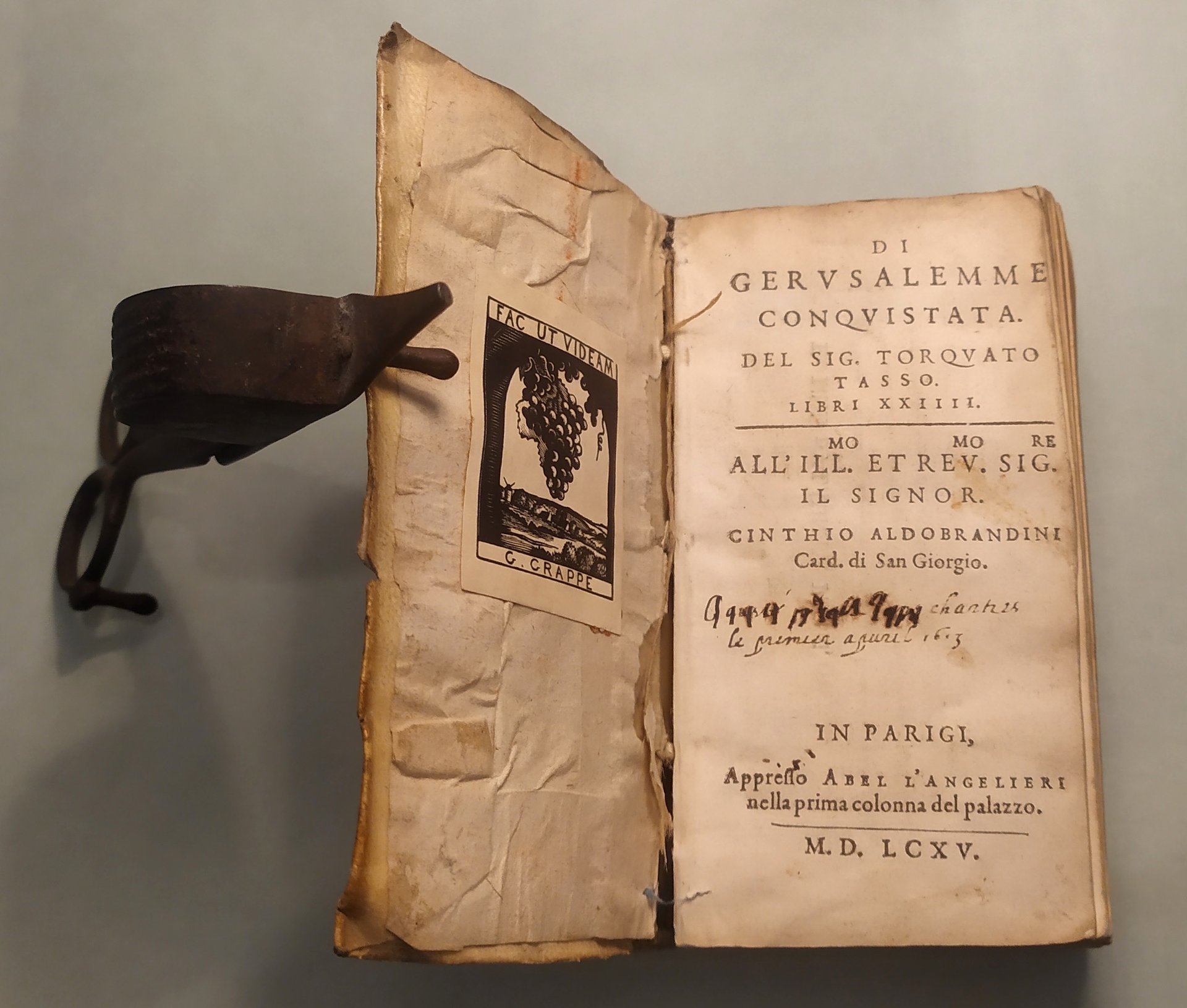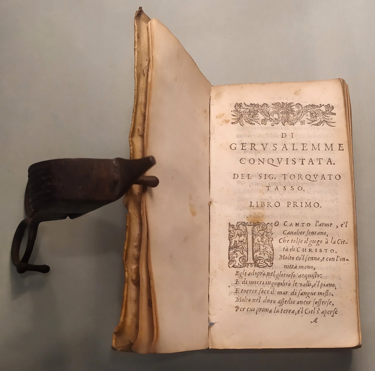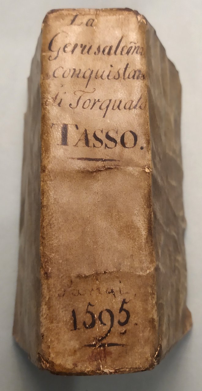 In Parigi, Appresso Abel L’Angelieri nella prima colonna del palazzo, 1595. In 12mo; cc.10n.nn., 361,2n.nn. Pergamena coeva, titolo calligrafato al dorso. Raccolta Tassiana,1041: ”Di questa rarissima edizione ci dà alcune belle e recondite notizie il celebre Apostolo Zeno, in una lettera scritta da Vienna a suo fratello … “Questa edizione è rarissima e stimatissima, poiché ben sapete che ella fu condannata e soppressa con decreto del Parlamento di Parigi del dì primo settembre 1595, a riguardo … di XVIII versi … come contenenti sentimenti contrari all’autorità del re e al bene del regno (Serassi)”. Gamba,964.
