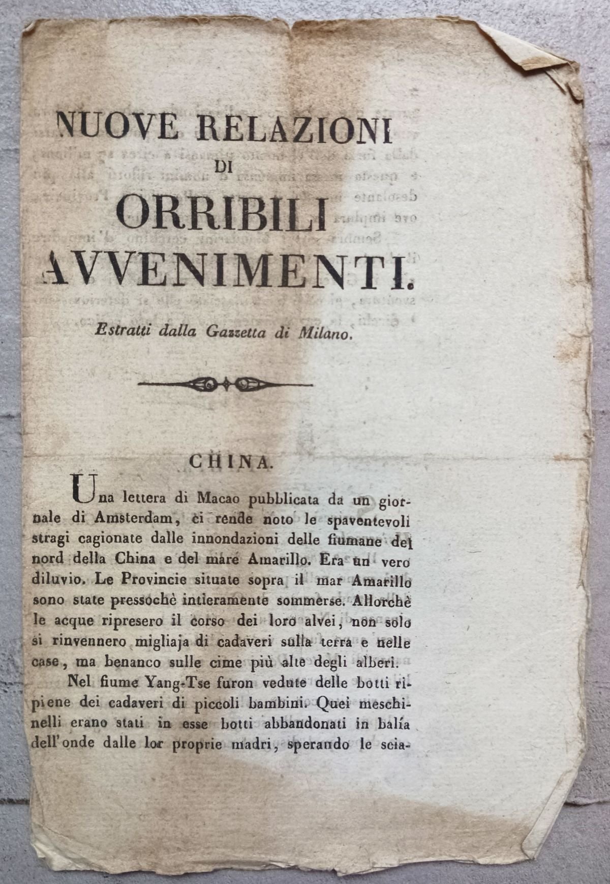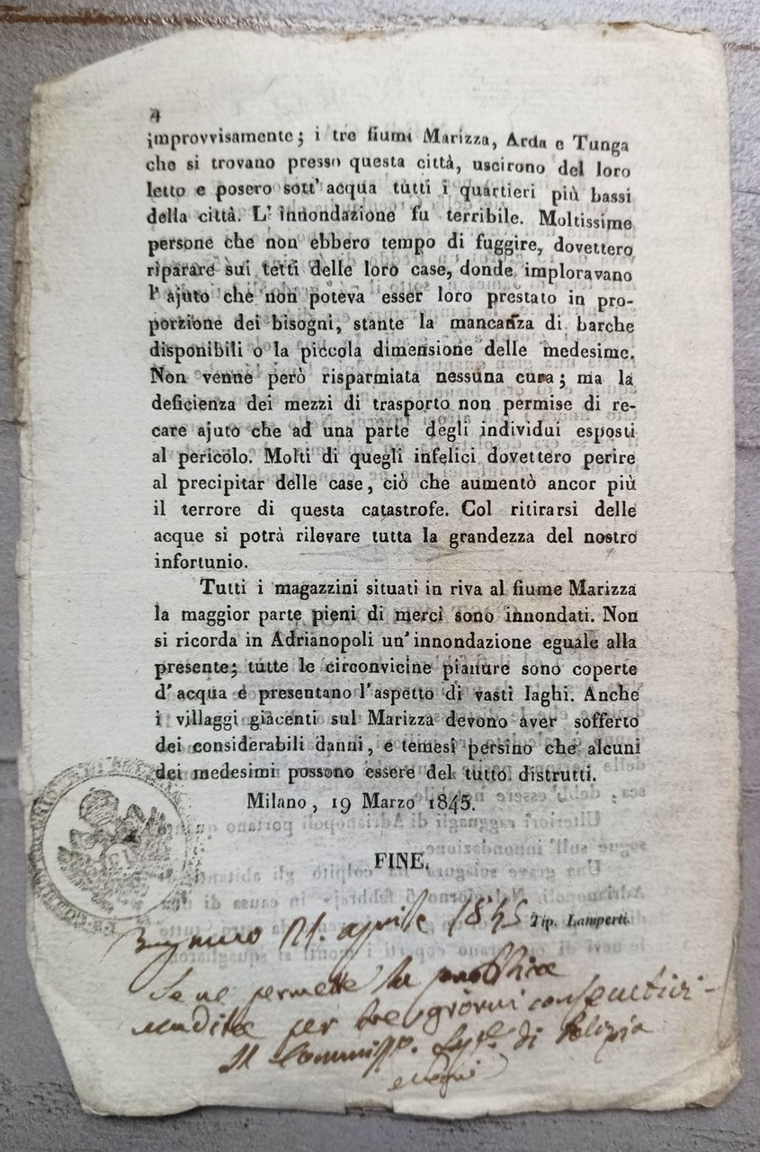 >In-8 (mm 207 x 137), pp. 4. Carta vergellata. La relazione descrive i fatti accaduti in Cina, Italia, America (Groenlandia , America danese) e Adrianopoli, nell'anno 1945, a seguito di una ondata di freddo e cattivo tempo che portò inondazioni e devastazioni ovunque. Il racconto, pubblicato sulla Gazzetta di Milano, riporta con dovizia di particolari gli scempi e le morti causati da piogge e freddi inusuali. Esemplare in discreto stato di conservazione; macchia di umidità sulla prima pagina. Antica annotazione dattiloscritta su quattro linee con data (21 aprile 1845) che ne permette la vendita e timbro evanescente, in basso nell'ultima pagina.