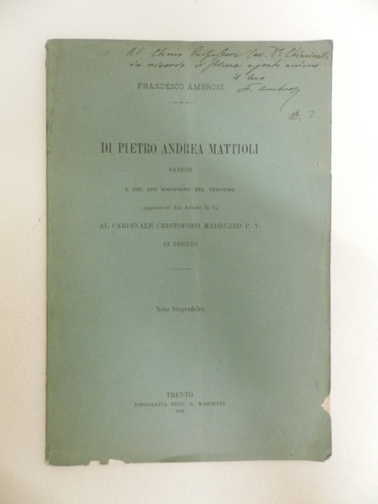 8^, pp. 17, brossura editoriale, titolo al piatto, ritratto di Mattioli all'antiporta. dedica dell'autore alla copertina. Esemplare molto buono. Cenni biografici del celebre umanista e medico senese. *** TUTTI I NOSTRI LIBRI SONO VISIBILI PREVIO CONTATTO MAIL O TELEFONO NELLA NUOVA SEDE DI MILANO: LIBRERIA COSMOPOLIS, VIA JOMMELLI, 22. ***