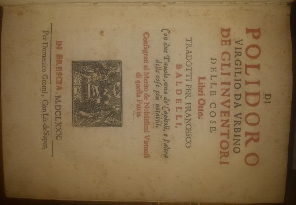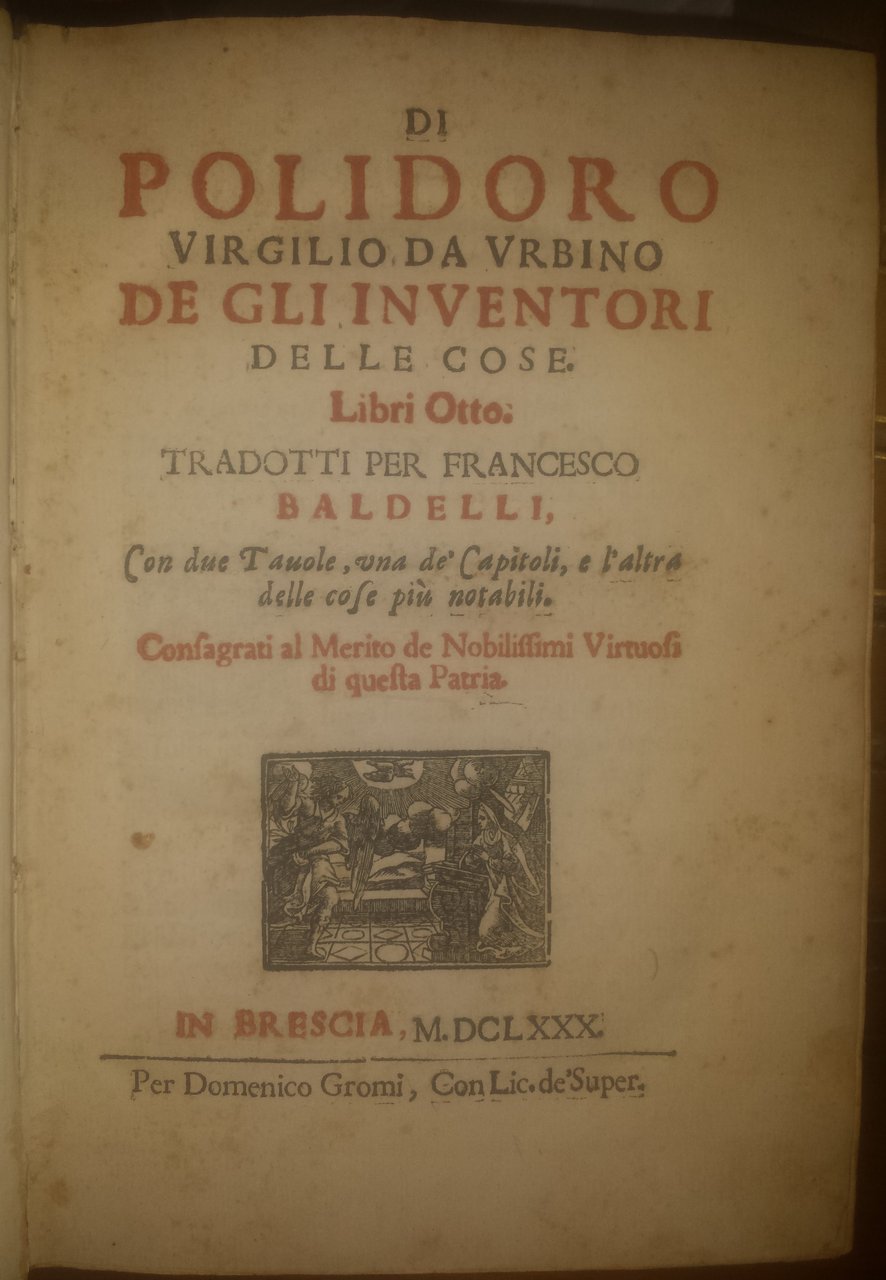 Di Polidoro Virgilio da Vrbino De gli inuentori delle cose. Libri otto. Tradotti per Francesco Baldelli, con due tavole, vna de' capitoli, e l'altra delle cose più notabili. Consagrati al merito de nobilissimi virtuosi di questa Patria.