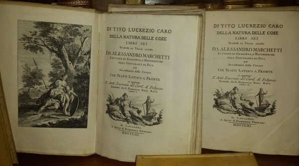 Di Tito Lucrezio Caro della Natura delle cose. Libri sei. Tradotti in verso sciolto da Alessandro Marchetti Lettore di Filosofia, e Matematiche nell'Università di Pisa ed Accademico della Crusca. Col testo latino a fronte. Si aggiunge L'Anti-Lucrezio del Card. Di Polignac. Tradotto da D. Francesco Maria Ricci. Tomo I e II.