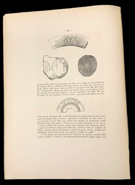 In folio; (6), 102, (3) pp. e 20 c. di tav. Brossura editoriale illustrata con titolo impresso, entro cornice, al piatto anteriore. Qualche piccola mancanza alla brossura del dorso. Qualche lievissima fioritura dovuta alla qualità della carta e nel complesso esemplare in buone condizioni di conservazione. Antica firma d'appartenenza al margine alto del piatto anteriore e piccolo timbro di appartenenza privata al piatto anteriore ed al frontespizio che identifica l'esemplare come appartenuto al Principe Lorenzo Corsini come dono, autografo, del Conte Pompeo Aria, celebre archeologo che sulle orme del padre Giuseppe, fu il primo organizzatore della collezione etrusca della città di Marzabotto.