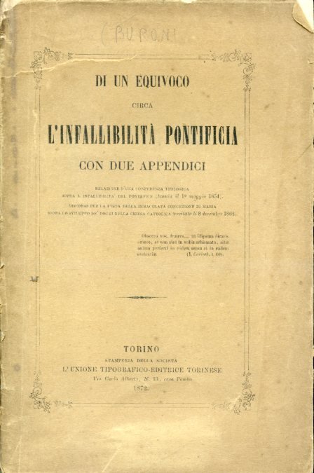 Di un equivoco circa l'infallibilità pontificia. Con due appendici. Relazione d'una conferenza teologica sopra l'infallibilità del pontefice (tenuta il 1° maggio 1854). Discorso per la festa della Immacolata Concezione di Maria sopra lo sviluppo de' dogmi della Chiesa Cattolica (recitato li 8 dicembre 1862)
