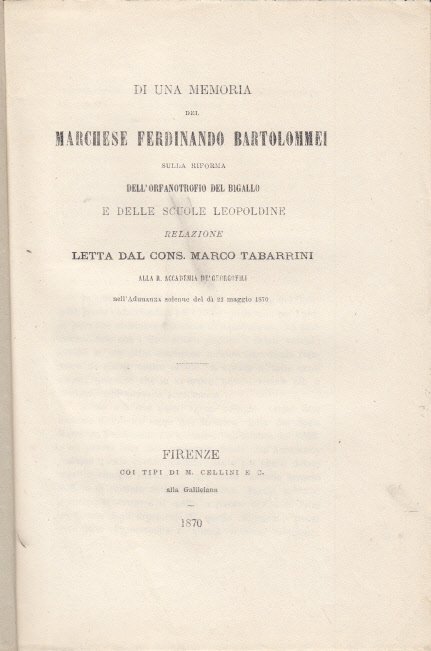 DI UNA MEMORIA DEL MARCHESE FERDINANDO BARTOLOMMEI SULLA RIFORMA DELL'ORFANOTROFIO DEL BIGALLO E DELLE SCUOLE LEOPOLDINE RELAZIONE LETTA DAL CONS. MARCO TABARRINI ALLA R. ACCADEMIA DE' GEORGOFILI NELL'ADUNANZA SOLENNE DEL Dì 22 MAGGIO 1870