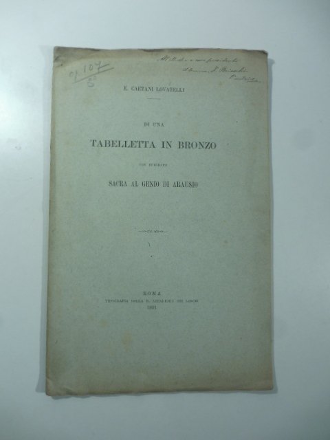 In 8, cm 17 x 26, pp. 10 con 1 tavola fuori testo in litografia. Brossura editoriale con dedica autografa dell'autrice. Scritto di questa che viene considerata una delle primissime archeologhe italiane, la prima ammessa all'Accademia dei Lincei