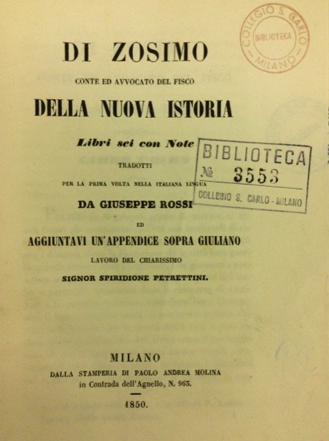 DI ZOSIMO, CONTE ED AVVOCATO DEL FISCO, DELLA NUOVA ISTORIA. - Libri sei con Note. Tradotti per la prima volta nella italiana lingua da Giuseppe Rossi ed aggiuntavi un'Appendice sopra Giuliano, lavoro del Chiar.mo Spiridione Petrettini.