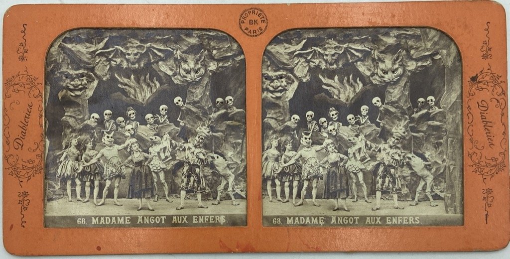 Immagine streoscopica all’albumina con interventi a mano, montata in cornice fustellata in cartoncino arancio con titoli e fregi in nero, velina al verso. La cornice misura circa cm 9x17.5 e le due finestrelle fustellate cm 7x7 circa, con angoli superiori smussati. Didascalia in lastra col titolo. Buono stato di conservazione, immagine ben contrastata, lievi difetti sulla velina bianca sul retro. Rara immagine della serie delle “Diableries” pubblicate attorno agli anni ’60 e ’70 del XIX secolo da alcuni studi ed artisti parigini. Le surreali immagini raffiguravano scene infernali di grande effetto, spesso con riferimenti alla cultura e politica del tempo, realizzate fotografando accuratissimi diorami in terracotta realizzati da specialisti quali Louis Alfred Habert (1824-1893) e Pierre Adolphe Hennetier (1828-1888), stampando le immagini su sottilissime carte all’albumina che venivano poi colorate e forate a mano e montate con una velina bianca al verso in modo che osservate attraverso il visore stereoscopico avessero parti più meno significative colorate e luminescenti (fiamme, occhi dei demoni, ecc). Habert, autore della prima serie di Diableries di cui questa immagine è la numero 68, lavorò dapprima con l’editore François Benjamin Lamiche e in un secondo momento con Adolphe Block che acquisì presumibilmente il catalogo di Lamiche, ri-pubblicando alcune stereografie. Altre serie inoltre furono pubblicate anonimamente, talvolta riproducendo soggetti della prima. Questa particolare immagine, marcata BK (il monogramma di Block) raffigura l’arrivo agli inferi di Madame Angot, personaggio del teatro popolare e dell’operetta, caricatura della popolana arricchita che ostenta una maldestra raffinatezza senza riuscire a nascondere le proprie origini. May, A68.