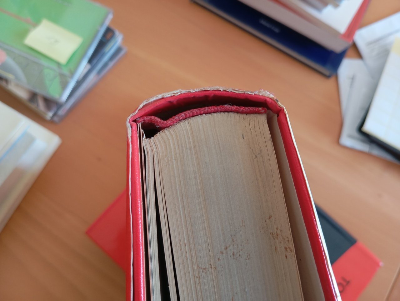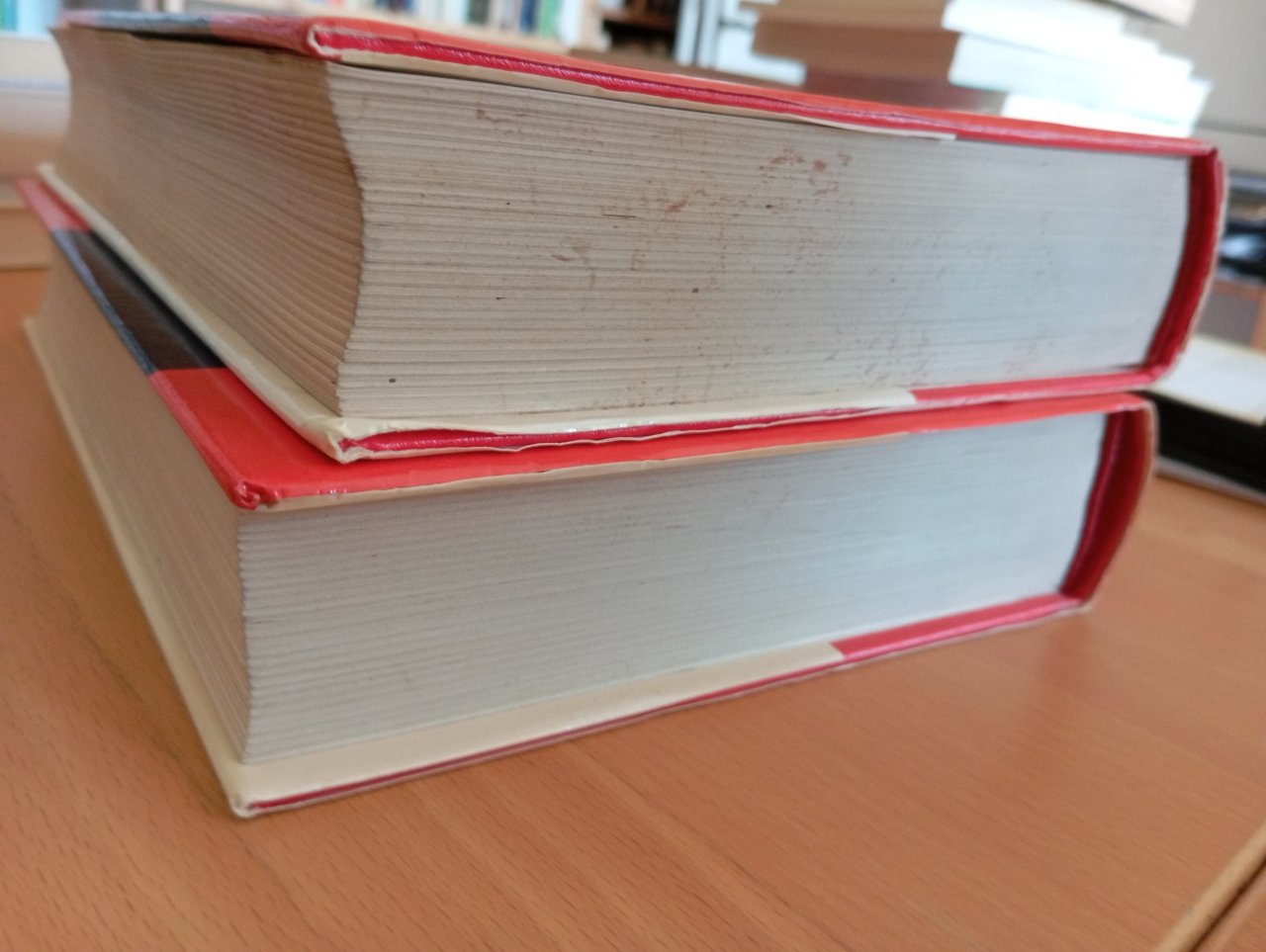 Sovracopertina con alcuni lievi segni di usura, come da foto. Tagli superiori impolverati nel primo volume, indebolimento non comprimettente della legatura nel primo volume, come da foto