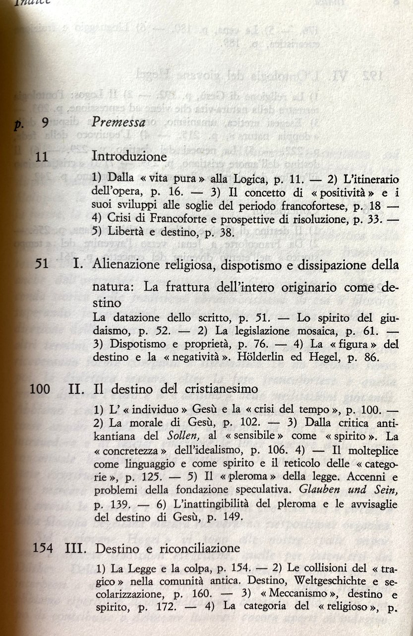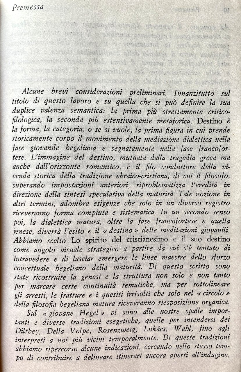 Premessa. Alcune brevi considerazioni preliminari. Innanzitutto sul titolo di questo lavoro e su quella che si può definire la sua duplice valenza semantica: la prima più strettamente critico- filologica, la seconda più estensivamente metaforica. Destino è la forma, la categoria, o se si vuole, la prima figura in cui prende storicamente corpo il movimento della mediazione dialettica nella fase giovanile hegeliana e segnatamente nella fase francofortese. L'immagine del destino, mutuata dalla tragedia greca ma anche dall'orizzonte romantico, è il filo conduttore della vicenda storica della tradizione ebraico-cristiana, di cui il filosofo, superando impostazioni anteriori, riproblematizza l'eredità in direzione della sintesi speculativa della maturità. Tale nozione in altri termini, adombra esigenze che solo in un diverso registro riceveranno forma compiuta e sistematica. In un secondo senso poi, la dialettica matura, oltre la fase francofortese e quella jenese, diverrà l'esito e il «destino» delle meditazioni giovanili. Abbiamo scelto Lo spirito del cristianesimo e il destino suo come angolo visuale strategico a partire da cui s'è tentato di intravedere e di lasciar emergere le linee maestre dello sforzo concettuale hegeliano della maturità. Di questo scritto sono state ricostruite la genesi e la struttura non solo e non tanto per marcare certe continuità tematiche, ma per sottolineare gli arresti, le fratture e i quesiti irrisolti che solo nel circolo della filosofia hegeliana matura riceveranno riesposizione organica. Sul giovane Hegel vi sono alle nostre spalle importanti e diverse tradizioni esegetiche, quelle per intendersi dei Dilthey, Della Volpe, Rosenzweig, Lukács, Wahl, fino agli interpreti a noi più vicini temporalmente. Di queste tradizioni abbiamo ripercorso alcune indicazioni, cercando nello stesso tempo di contribuire a delineare itinerari ancora aperti all'indagine.