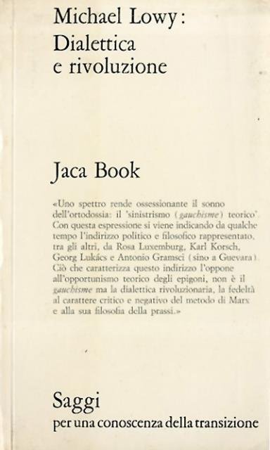 168 p. ; 23 x 14 cm. Saggi per una conoscenza della transizione, 57. I saggi raccolti in questo volume hanno per oggetto l'analisi di Marx, Lenin, Rosa Luxemburg, il marxismo in Russia e America latina. Vengono affrontati, in questo contesto temi della problematica della corrente dialettico-rivoluzionaria del marxismo. Questa ricostruzione della dialettica marxista passa necessariamente attraverso un «refolamento dei conti» teorico con l'althusserianesimo. Le implicazioni politiche, non solo implicite, ma anche esplicite, tratte in particolare a partire dalla meditazione del discorso di Guevara, permettono una analisi importante delle illusioni riguardanti iil progresso che da troppo parte del mondo sarebbero attuate tramite la costruzione di fronti popolari e, in fondo, tramite un rifiuto di una effettiva rivoluzione sociale. Titolo originale dell'opera: «Dialectique et revolution». Traduzione dal francese di Claudio Papini . Brossura editoriale, coperta in cartoncino flessibile plastificato lucido con alette. Codice libreria 9559.