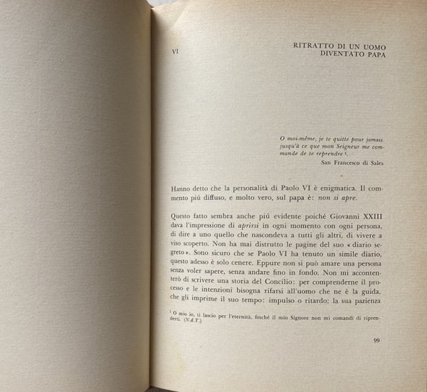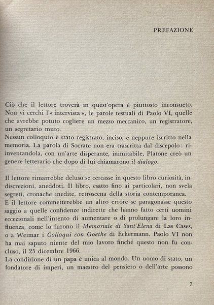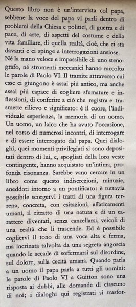 Questo libro non è un'intervista col papa, sebbene la voce del papa vi parli dentro di problemi della Chiesa e politici, di guerra e di pace, di arte, di aspetti del costume e della vita familiare, di quella realtà, cioè, che ci sta davanti e ci spinge a interrogazioni ansiose. Né la mano veloce e impassibile di uno stenografo, né strumenti meccanici hanno raccolto le parole di Paolo VI. Il tramite attraverso cui esse ci giungono è assai più antico, ma anche assai più capace di cogliere sfumature e inflessioni, di conferire a ciò che registra e trasmette rilievo e significato: è il cuore, l'individuale esperienza, la memoria di un uomo.