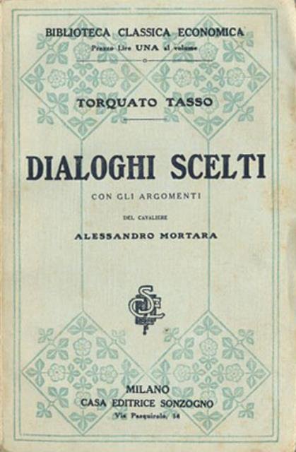 Ed. stereotipa. 349 p. ; 19 x 13 cm. Biblioteca classica economica, 58. Con gli argomenti del cavaliere Alessandro Mortara. Prefazione di Francesco Costèro. Volume unico. La stesura di prose dialogiche impegnò Tasso fin dal 1578, anno della composizione del "Forno ovvero de la Nobiltà". La dialogistica tassiana è stata da sempre relegata al margine dalla critica: De Sanctis accenna soltanto al "Minturo ovvero della Bellezza", limitandosi ad asserire che Tasso da giovane fu "infetto dalla peste filosofica". Un giudizio a dir poco sminuente se si considera che il poeta compose venticinque dialoghi (e questa è solo la cifra canonica; non si fa riferimento, infatti, agli abbozzi e ai rimaneggiamenti) e vi pose il suo impegno fino alla morte. Una valutazione più precisa è fornita da Donadoni: lo studioso dedica un intero capitolo della sua monografia ai Dialoghi indagandone trame, fonti e suggestioni. La prima edizione moderna del corpus dialogico tassiano è quella di Guasti (1858-1859), il quale, però, non riuscendo a reperire tutti i manoscritti dei Dialoghi si basa sui testimoni a stampa, dando vita ad un’edizione, che presenta corruttele da far rabbrividire i moderni filologi. Brossura editoriale, coperta in cartoncino flessibile. Qualche segno del tempo alla coperta e delle pagine (fioriture e ingiallimento della carta). Codice libreria 5628.