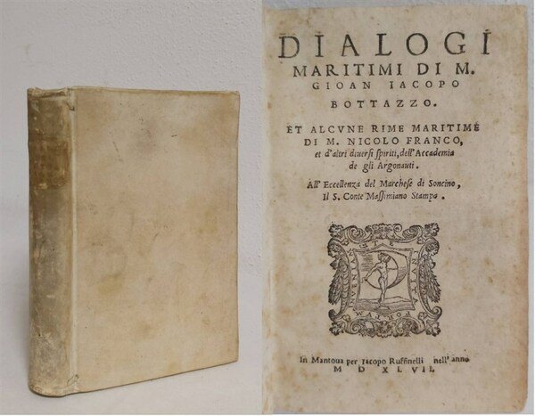 in-16, cc 168, rileg. settecentesca perg. con tass. al d. Marca tipogr. in legno al front. raff. la Fortuna che regge una vela gonfiata dal vento incorniciata dal motto "Te invita portum inveniam". Dedicat. a Massimiano Stampa Conte di Soncino. Bel trattato, certamente raro, in cui si tratta della geografia, dei venti, della sfera e delle cose celesti. Doveva comprendere anche un quarto capitolo dedicato alle gesta di Alessandro Magno ma un avviso a c.127verso annuncia che sarebbe stato inserito in un secondo volume, insieme ad ulteriori Dialoghi di N. Franco sui pesci e sulla fortuna, e di G.F. Arrivabene sulle bussole e calamita. Non sembra però la notizia avere riscontro in nessuna altra pubblicazione. L'A., di origini piemontesi, fu noto viaggiatore e fondatore dell'Accademia degli Argonauti a Venezia. I Dialoghi tra i personaggi si svolgono presso la corte gonzaghesca di Casale Monferrato, dove il Bottazzo era precettore di Isabella, figlia di Margherita Paleologa e Federico II Gonzaga. Nella seconda parte sono contenute rime di diversi letterati con i nomi arcadici, tra cui il mantovano Giovanni Arrivabene (Oronte) e Nicolò Franco, fondatore insieme al Bottazzi dell'Accademia degli Argonuati. Tra gli altri: Ferrante Bagno (Anceo), Pietro Catalano (Ergino), Nicolò Gallina, Girolamo Giustiniano, Giovanni Francesco Montiglio (Canopo), Bessario de’ Malvezzi (Palinuro), Giovanni Vincenzo Massa, Giovanni Battista Pappazzone, Giovanni Giacomo del Pero (Telone), Cristoforo Picco (Amicla), Matteo Vercellese. Si aggiungono tre canzoni: La maritima di Ferrante Bagno, L'Hydromantia maritima e Cloanto dell'Arrivabene. Ediz. orig. Qualche carta legg. brun. Le ultime 2 cc legg. corte al margine sup. Bell'esempl. di rara cinquecentina. [475]