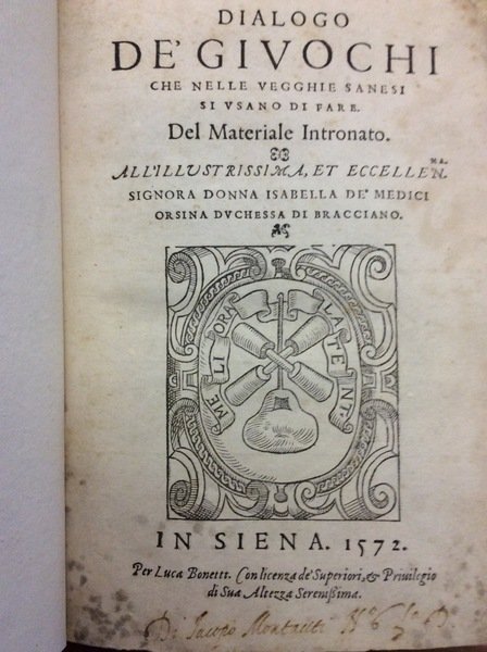 In-8 p. (mm. 222x152), mezza pergamena antica (risguardi rifatti), titolo manoscritto al dorso, pp.num. 223 (al verso l'Errata), grande vignetta xilografica al frontespizio raffigurante lo stemma dell'Accademia degli Intronati e con marca tipografica in fine. Dedicato a Isabella de' Medici Orsina, Duchessa di Bracciano. Fra i giochi descritti si fa anche un riferimento ai tarocchi (a p. 77).Rarissima "prima edizione" di questo spigliato Dialogo, interessante per il folclore, considerato il più importante lavoro di Girolamo Bargagli (1537-1586), scrittore senese.Cfr. Parenti, p. 55 - Brunet,II,666 "Ouvrage singulier" - Gamba,1237: "L'Autore si copre sotto il nome del "Materiale Intronato". Quantunque poco corretta, la migliore d'ogni altra posteriormente fatta" - Choix de Olschki,II,2567 che cita una edizione del 1575: "Ouvrage fort rare et curieux, sur les jeux et divertissements de la noblesse de Sienne". Frontespizio (restaurato per angoli mancanti) e prime 50 pp. con piccole macchie marginali, qualche alone o traccia d'uso nel testo, ma complessivamente un buon esemplare.