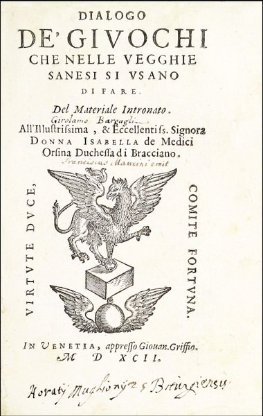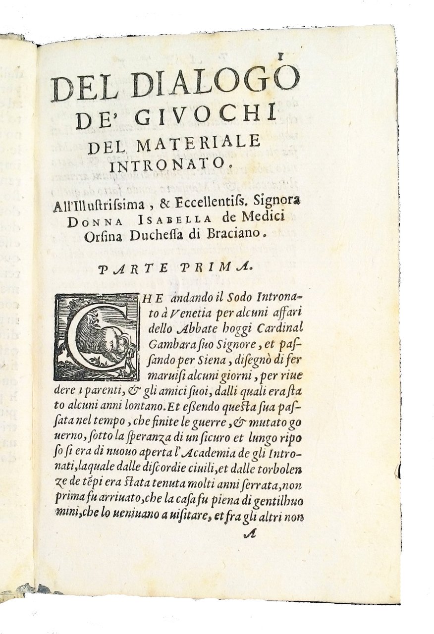 Dialogo de’ giuochi che nelle vegghie sanesi si vsano di fare. Del materiale intronato. All'illustrissima, & eccellentiss. Signora donna Isabella de Medici Orsina duchessa di Bracciano.