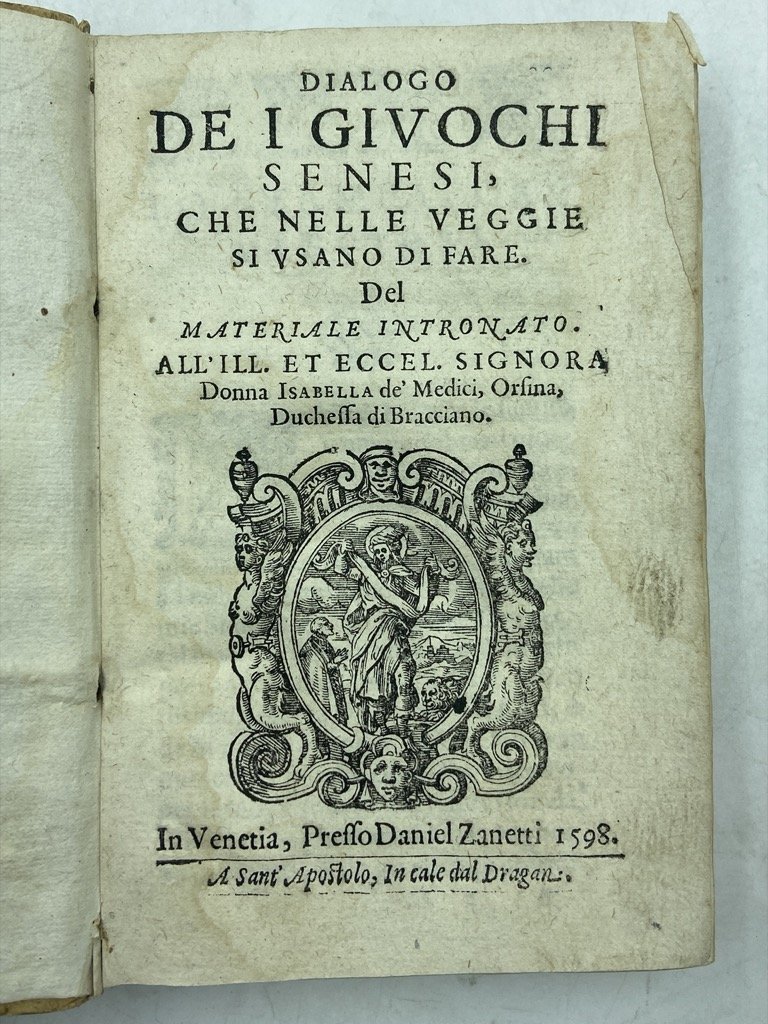 DIALOGO DE I GIUOCHI SENESI, CHE NELLE VEGGIE SI USANO DI FARE. Del MATERIALE INTRONATO. All'Ill. et Eccel. Signora Donna Isabella de' Medici, Orsina, Duchessa di Bracciano. In Venezia, Presso Daniel Zanetti 1598.