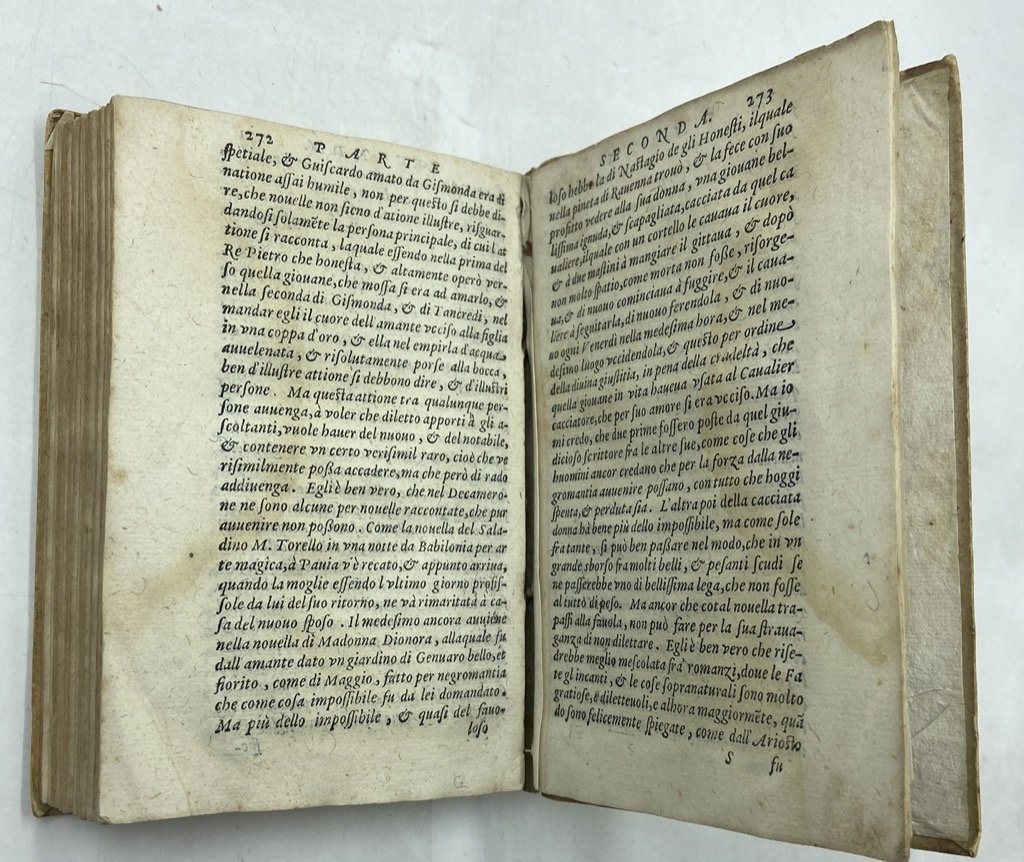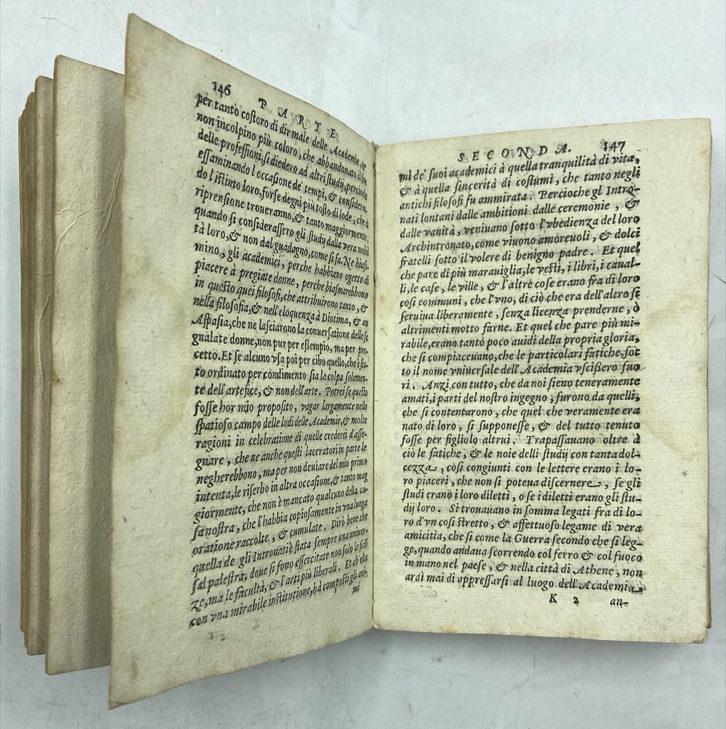 Un volume in ottavo, cm 15 x 10, pp 288, legatura in cartone rustico con nervi passanti e titolo manoscritto sul dorso. Cartone rustico settecentesco con lievi segni del tempo, margini delle pagine un poco rifilati, tenue gora sul margine esterno di alcune carte ma complessivamente buon esemplare. Opera giovanile di Girolamo Bargagli pubblicata per la prima volta nel 1572 (Siena, Bonetti) ma scritta presumibilmente nel 1563 come sorta di commiato dall'Accademia degl'Intronati, dovendosi ormai dedicare l'autore agli studi giuridici e non più alle piacevolezze letterarie. A questo Dialogo, così come alla commedia La Pellegrina composta per le nozze tra Ferdinando I de Medici e Cristina di Lorena, è oggi legato il nome del letterato senese; il Dialogo conobbe fin dalla sua prima pubblicazione un certo successo e fu più volte ristampato nell'ultimo quarto del XVI Secolo. Composta sul modello del dialogo platonico e pervasa di una malinconica nostalgia, l’opera tratta dei giochi di società che avevano luogo nelle serate dell’Accademia degl’Intronati di Siena, presentando 137 giochi e varianti in un catalogo di eccezionale rilevanza quale documento folklorico, e insieme testimonianza di prima mano della vita sociale e intellettuale della borghesia e della nobiltà senese tra tardo Rinascimento e Controriforma. Di particolare interesse, oggi, la trattazione della presenza delle donne nelle riunioni degl’Intronati, ricordate dall’autore non solo per le doti di grazia e bellezza ma per le qualità di arguzia, intelligenza e cultura necessarie per questi giochi. I giochi, essenzialmente verbali e galanti, sono divisi in Gravi e Piacevoli, e presentati in indice alfabetico all’inizio del volume; tra gli altri citiamo quelli dell’A.B.C., de’ Dadi, delle Ghirlande, delle Imprese, degli Indovinelli, degl’inganni, de’ Tarocchi, degli Ubriachi. Melzi, II, 169; Pitrè, Bibliografia delle tradizioni popolari d'Italia, n. 2183; Olschki, Choix, 2567 (altra edizione): «Ouvrage fort rare et curieux, sur les jeux et les divertissements de la noblesse de Sienne»; Cicognara, 1632; Gamba, 1237; Graesse, I, p. 292; Brunet, II, 666: «Ouvrage singulier».