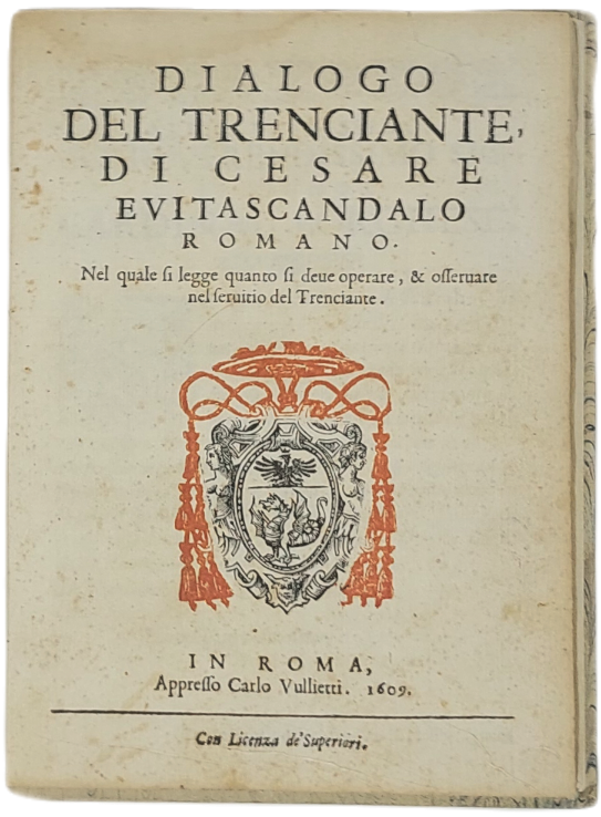 >In-4 (mm 211x150), pp. (8), 100. Frontespizio con stemma inciso su legno del dedicatario - il cardinale Scipione Borghese - stampato in rosso e nero. Altro stemma, inciso a piena pagina, a introdurre il testo. Testatine, iniziali ornate e finalini silografici. Legatura moderna in cartonato ricoperto in carta decorata a pettine. Prima edizione, indirizzata al cardinale Borghese, dell'importante trattato dedicato al trinciare da questo grande protagonista della scuola romana. “È la conferma del primato di questa scuola e dell'importanza che avrà più tardi nel diffondere in tutta Europa una raffinata manualità con il trionfo del ‘trinciare in aria' anche se Evitascandali non esclude la possibilità di posare gli animali di maggiori dimensioni sul piatto sottostante per fare riposare il braccio sinistro che sopporta il peso della forchetta con la quale si ‘imbrocca' [...] Qui, per la prima volta, viene illustrata la tecnica per trinciare - o meglio per servire - le vivande all'ultima moda, l'olla podrida con un coltello e un grande cucchiaio d'argento oppure la capirottata [...]” (C. Benporat, Cucina e convivialità italiana del Cinquecento, Firenze 2007, pp. 48-49). Esemplare discreto, diffuse bruniture, ampie gore, alle carte L2-M6 evidenti fori a ledere il testo. Drexel 1029; Westbury 92; Paleari Henssler 699; B.IN.G. 789.