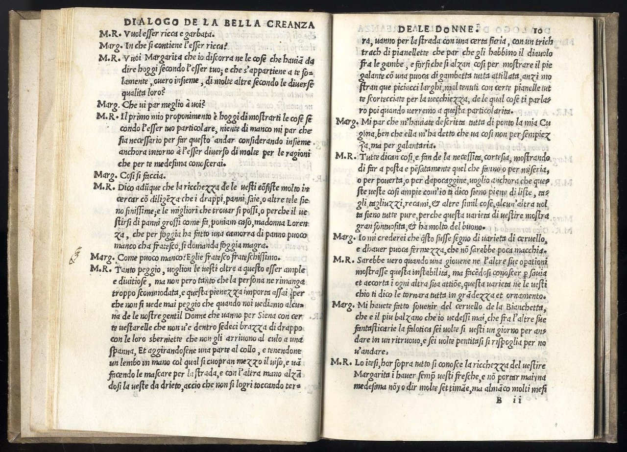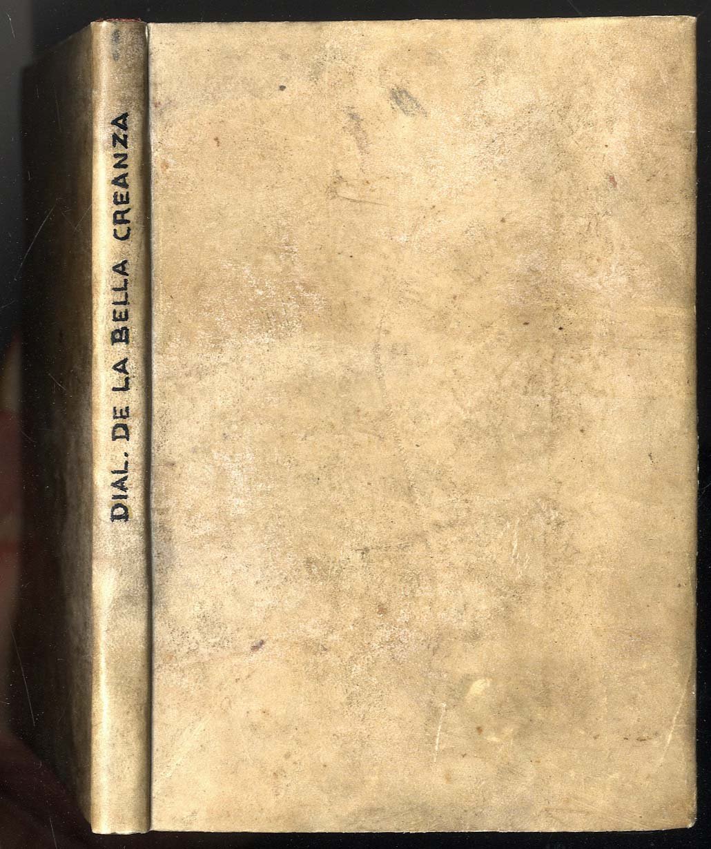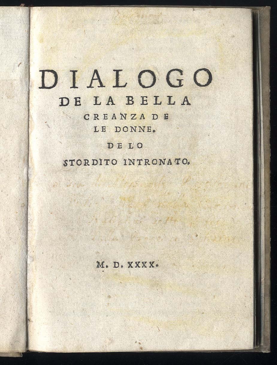 >in-8 picc., ff. 39 num. (manca il f.40, bianco), caratt. corsivo., una iniziale istoriata. Leg. in pergamena ad imitazione. Seconda edizione, che segue di un solo anno la prima di Curtio Navò 1539, ed è parimenti rarissima. Alessandro Piccolomini, che nel presente dialogo si cela sotto lo pseudonimo di Stordito Intronato, fu filologo e letterato (Siena 1508-1578). Croce considera il presente ''dialogo'' in versi tra Raffaella e Margherita la ''commedia della corruzione...tutti gli accorgimenti di bellezza e trappolerie atti a condurle l'amante desiderato''. Un solo esemplare localizzato in Italia, alla Biblioteca Alessandrina di Roma. Gamba n.1572 ''assai raro''. BMSh.T., Italian, p-648. Croce, La Critica, 28 (1930). Non in Adams.