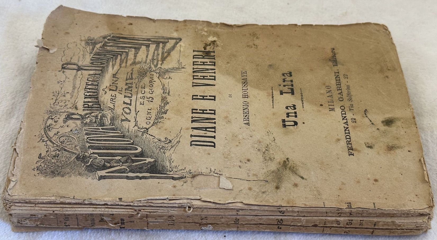 Edizione del 1883 di questo volume di arte di Arsenio Houssaye. All'interno: Leonardo da Vinci e Gioconda, Fornarina, Tiziano e Violante, Paolo Veronese, Holbein, I Breughel, Davide Teniers e Anna Breughel, Rubens, Van Dyck e la Mugnaia, I Pittori di Taverna, come muoiono le donne ecc. In mediocri condizioni. Copertina editoriale in buone condizioni con lievi usure marginali. Piatto posteriore assente. Legatura in discrete condizioni con rotture e qualche pagina staccata. Pagine in buone condizioni generali con fioriture. In 8. Dim. 20x12,5 cm. Pp. (4)+231+(3).Edition of 1883 of this volume of art by Arsenio Houssaye. Inside: Leonardo da Vinci e Gioconda, Fornarina, Tiziano e Violante, Paolo Veronese, Holbein, I Breughel, Davide Teniers e Anna Breughel, Rubens, Van Dyck e la Mugnaia, I Pittori di Taverna, come muoiono le donne ecc. In poor conditions. Editorial cover in good conditions lightly worn in the extremities. Back plate lacks. Binding in fair general conditions with cracks and some page detached.Inside pages are in good conditions with foxing. In 8. Dim. 20x12,5 cm. Pp. (4)+231+(3).