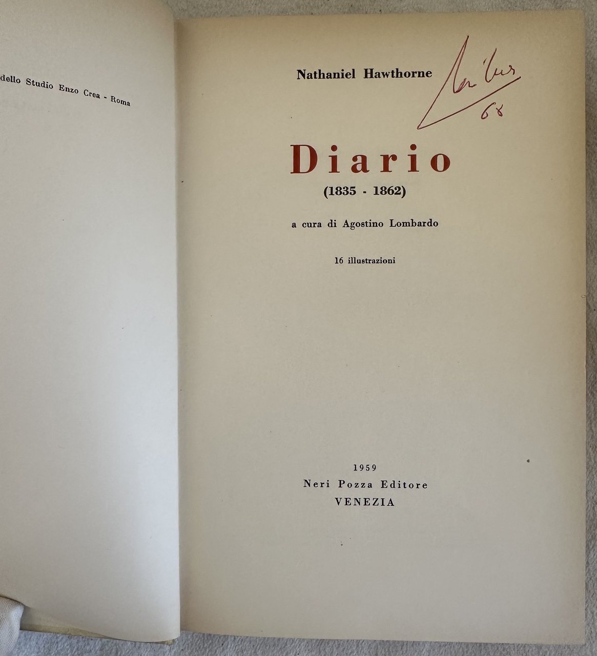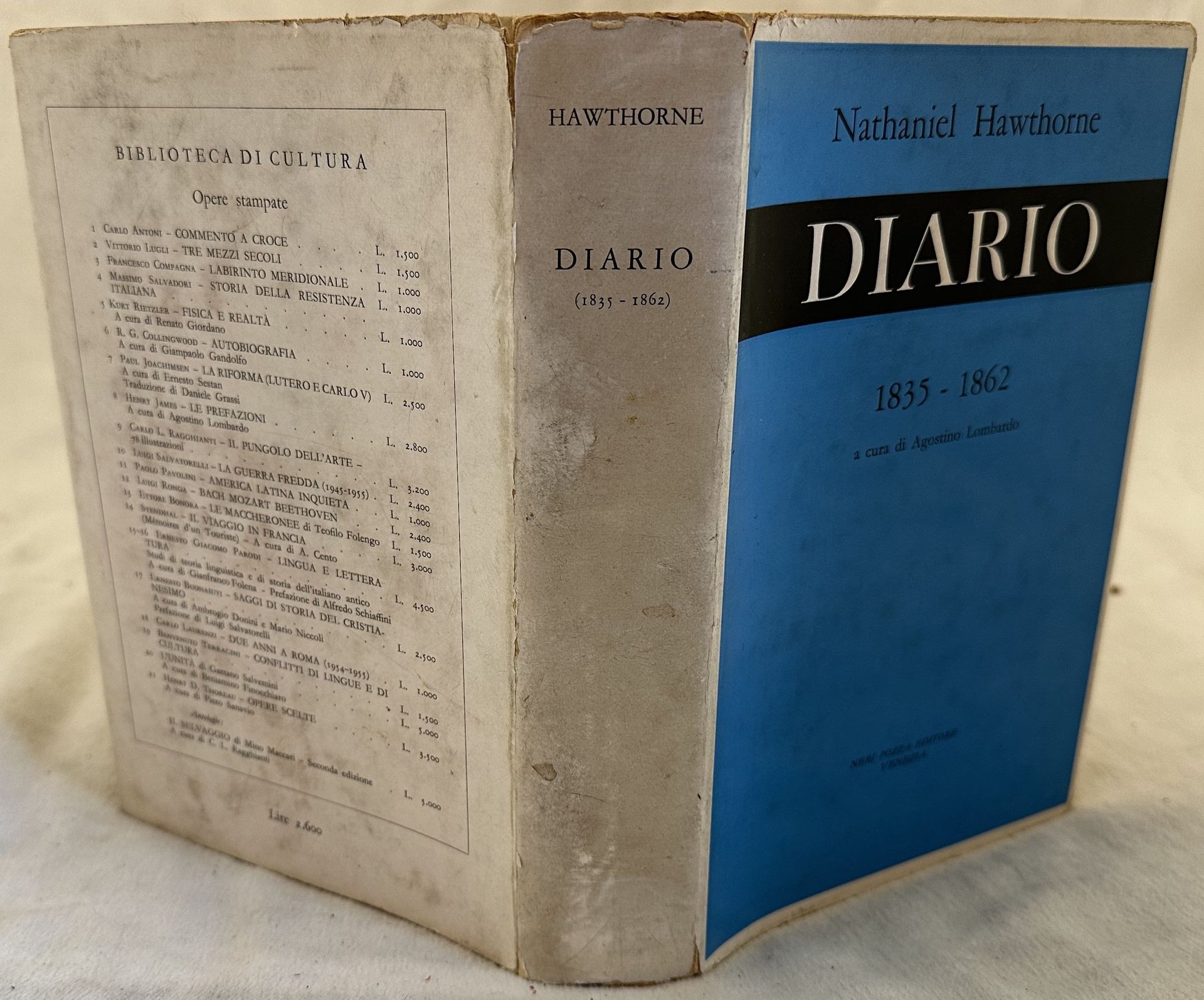 Edizione italiana del 10 ottobre 1959 di questo diario dello scrittore statunitense Nathaniel Hawthorne (1804-1864) a cura di Agostino Lombardo.<BR><BR>L'autore descrive il periodo dal 1835 e 1862.<BR><BR>All'interno sono presenti 16 tavole fotografiche fuori testo.<BR><BR>Firma datata 1968.<BR><BR>Note manoscritte nel testo.<BR><BR>In ottime condizioni.<BR><BR>Copertina in tela editoriale con sovraccoperta in ottime condizioni con lievi usure ai margini e dorso. Macchie al dorso. Legatura in buone condizioni. All'interno le pagine si presentano in buone condizioni con rare fioriture. In 8. cm 22x15. Pp. XXX+(2)+509+(3).Italian edition of 10th of october 1959 of this diary by the american writer Nathaniel Hawthorne (1804-1864) cared by Agostino Lombardo.<BR><BR>The author described the period from 1835 to 1862.<BR><BR>Inside there are 16 out of text photographic plates.<BR><BR>Signature dated 1968.<BR><BR>Handwritten notes in the text.<BR><BR>In very good conditions.<BR><BR> <BR><BR>Cloth editorial cover with dustjacket in very good conditions lightly worn in the extremities. Stains in the spine. Binding in good conditions. Pages are in good conditions with occasional foxing. In 8. cm 22x15. Pp. XXX+(2)+509+(3).