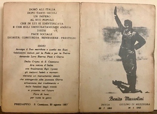 8vo (cm. 20,5), 214 pp., 1 c.nn. Con 28 illustrazioni su tavv. f.t. Brossura editoriale figurata (tracce d’uso marginali). Buon esemplare. Si unisce un cartoncino in ricordo di Benito Mussolini stampato a Predappio nel 1957.