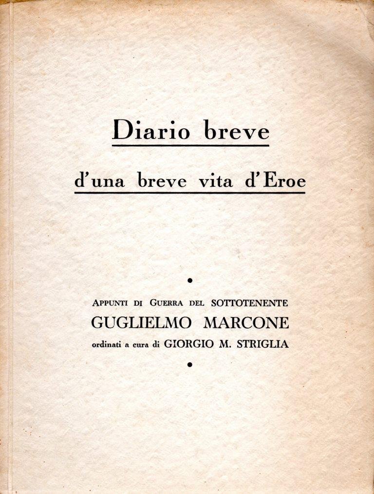 Diario breve d'una breve vita d'Eroe, prima edizione 1941, pp. 48, formato 16 x 21,5.<BR>Copertina morbida di colore crema con titoli in nero al piatto anteriore. Appunti di guerra del sottotenente Gugliemo Marconi. <BR>Ottime condizioni.
