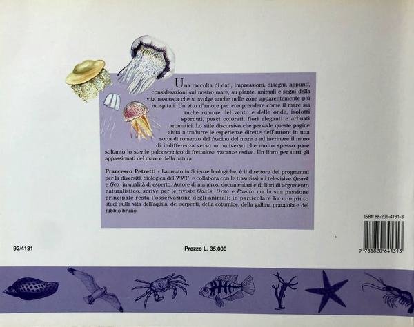 Soggetti: Natura, Ecologia, Ambiente, Mare, Biologia, Scienza della vita, Animali marini, Fauna, Pesci, Abissi, Vegetazione, Piante, Scienze marine, Flora, Immagini, Fotografie, Illustrazioni, Libri illustrati, Libri Vintage, Fuori catalogo, Enciclopedie, Glossario, Esplorazioni, Viaggio, Tirreno, Mediterraneo, Specie, Sub, Predatori, Plancton, Hobby, Tempo libero, Licia Colò, Diari, Memorie, Taccuini, Disegni, Estinzione, Tutela ambientale, Plastica, Wildlife drawings, Parchi marini, Naturalisti, Uccelli di mare, Limicoli, Geografia, Luoghi selvaggi, Anfibi, Migrazioni, Squali, Balene, Capodogli, Conchiglie, Scogliere, Divulgazione scientifica, Acqua, Cibo, Habitat, Avifauna, Schede, Inverno, Cetacei, Relitti, Estate, Spiagge, Costiera, Coste, Pinete, Sciabica, Volpoca, Piovanello, Misteri, Pesca, Pescatori, Granito, Calcare, Roccia, Altura, Rapaci, Gabbiani, Farfalle, Tane, Sciarrano, Scorfano, Sud, Italia, Calabria, Puglia, Mar Adriatico, Ionico, Campania, Macchia mediterranea, Capri, Isole, Pelagie, Capperi, Sicilia, Eolie, Pantelleria, Falco pellegrino, Delfini, Ichnusa, Sardegna, Foca monaca, Prolago, Pastinaca, Granchi, Molluschi, Alghe, Tonno, Occhiata, Oche, Lucertole, Lepre, Mormora, Lavarello, Pesce azzurro, Alici, Gamberi, Polpi, Scoglio, Anemone, Aguglie, Cavallette, Leoni, Stella maris, Ammofila, Cannolicchi, Orate, Spigola, Capre, Cefali, Etologia, Nature, Ecology, Environment, Sea, Biology, Life science, Marine animals, Fauna, Fish, Abyss, Vegetation, Plants, Marine sciences, Images, Photographs, Illustrations, Illustrated books, Out of print books, Encyclopedias, Glossary, Explorations Travel, Tyrrhenian, Mediterranean, Species, Sub, Predators, Hobbies, Leisure, Diaries, Memories, Notebooks, Drawings, Extinction, Environmental protection, Plastic, Marine parks, Naturalists, Sea birds, Limicolous, Geography, Wild places, Amphibians, Migrations, Sharks, Whales, Spermwhales, Shells, Reefs, Scientific disclosure, Water, Food, Birdlife, Tabs, Winter, Cetaceans, Wrecks, Summer, Beaches, Coastal, Coasts, Pine forests, Trawler, Shelduck, Sandpiper, Mysteries, Fishing, Fishermen, granite, Limestone, Rock, Hill, Birds of prey, Seagulls, Butterflies, Burrows, Redfish, South, Italy, Mediterranean scrub, Islands, Pelagias, Capers, Sicily, Peregrine falcon, Dolphins, Sardinia, Monk seal, Parsnip, Gran who, Molluscs, Algae, Tuna, Look, Geese, Lizards, Hare, Murmurs, Blue fish, Anchovies, Shrimps, Octopuses, Reef, Anemone, Needles, Grasshoppers, Lions, Razor clams, Bream, Sea bass, Goats, Mullet, Ethology, Libri per bambini, Books for children