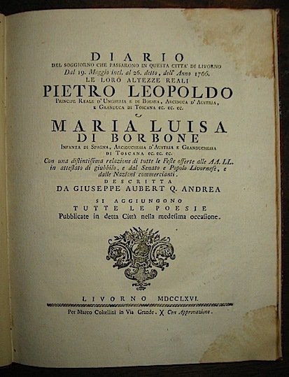 Diario del soggiorno che passarono in questa città di Livorno. le loro Altezze Reali Pietro Leopoldo. e Maria Luisa di Borbone.