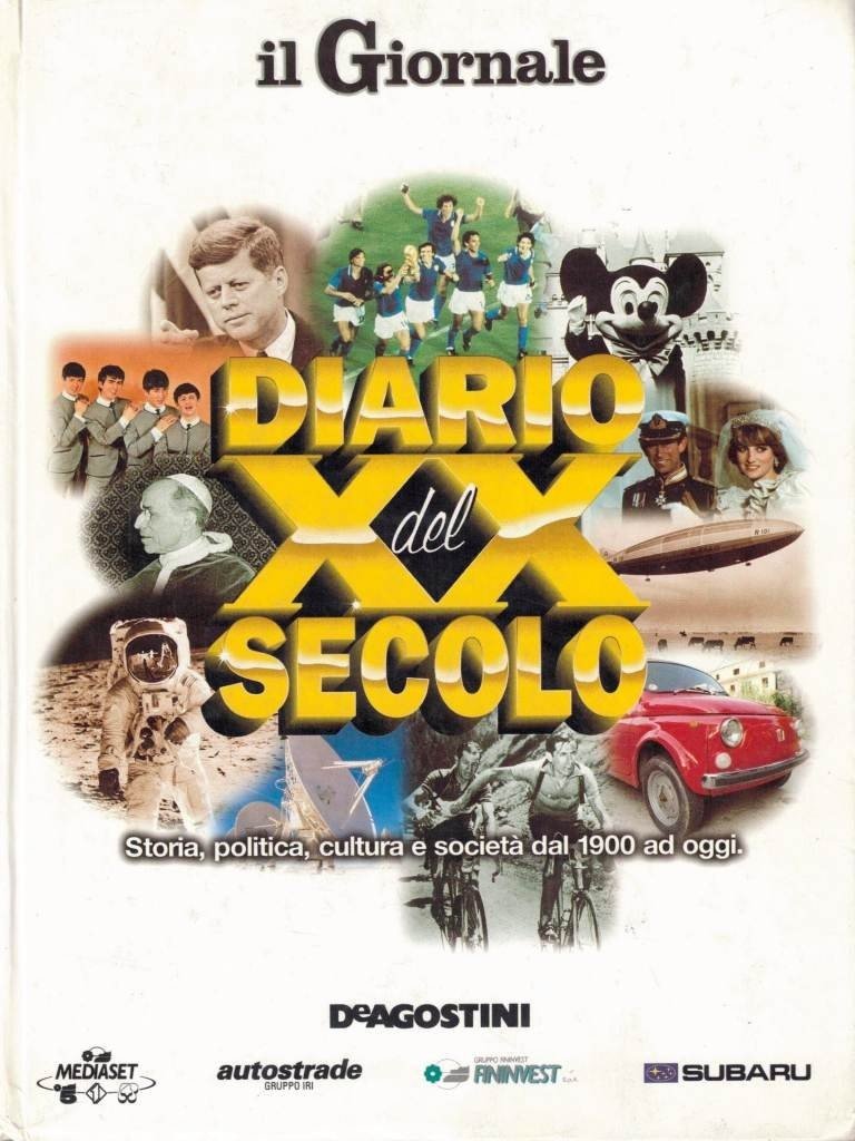 Diario del XX secolo, De Agostini, Novara 1998, pp. 592, ill. b.n. e col., cm 28, cart. ed. con titoli al al dorso e titoli e ill. col. al piatto. In testa al frontespizio: il Giornale. Sottotitolo alla prima di copertina: Storia, politica, cultura e società dal 1900 ad oggi. Supplementi rilegati de il Giornale. Opera realizzata da: Iniziative Speciali De Agostini. Direttore: Roberta Besana. Capo redattore: Luciano Mornacchi. Coordinamento dei testi: Sergio Chillè e Barbara Minelli. Testi a cura di: Ettore Colombo e Anna Spadolini. Traduzioni di: Maria Teresa Cattaneo e Metella Paterlini. Redazione: Lalla Riccardi. Indice: Mario Cervi, Presentazione – 1900-1909 Bell’epoque – 1910-1919 Guerra e rivoluzione – 1920-1929 Anni ruggenti – 1930-1939 L’età dei totalitarismi – 1940-1949 Gerra calda, guerra fredda – 1950-1959 Disgelo e distensione – 1960-1969 Competizione, contestazione – 1970-1979 Anni di piombo – 1980-1989 Sfida finale – 1990-1997 Nuovo dis(ordine) mondiale. Tracce d’uso, ma comunque ben conservato, con interno ben tenuto e legatura solida.