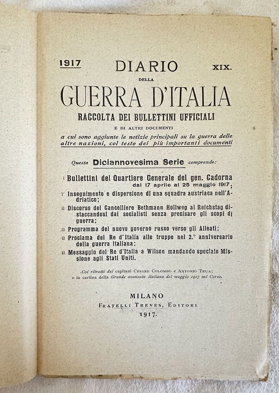 DIARIO DELLA GUERRA D'ITALIA RACCOLTA DEI BULLETTINI UFFICIALI 1917 XIX