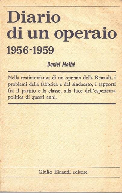 147 p. ; 22 x 14 cm. Nella vivace testimonianza di un operaio della Renault, i problemi della fabbrica e del sindacato, i rapporti fra il partito e la classe, alla luce dell'esperienza delle lotte del decennio 1950/1960. Un'opera di memorialistica che ha fatto scuola nella ricerca storiografica e sociologica delle condizioni economiche e sociali delle classi subalterne europee nell'epoca d'oro del fordismo della seconda metà del Novecento. Titolo originale dell'opera: «Journal d'un ouvrier». Traduzione di Danilo Montaldi. Brossura editoriale, coperta in cartoncino flessibile, titolo impresso in nero al piatto e al dorso. Leggeri segni del tempo (ingiallimento della carta), per il resto esemplare integro. Codice libreria 9620.