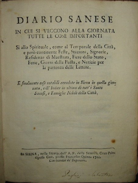 Diario sanese in cui si veggono alla giornata tutte le cose importanti sì allo Spirituale, come al Temporale della Città, e però continente Feste, Stazioni, Signorie, Residenze di Maestrati, Fiere dello Stato, Ferie, Giorni della Posta, e Notizie per la partenza delle Lettere. E finalmente cose notabili accadute in Siena in quella giornata, coll’Indice in ultimo di tutt’i Santi Sanesi, e Famiglie Nobili della Città
