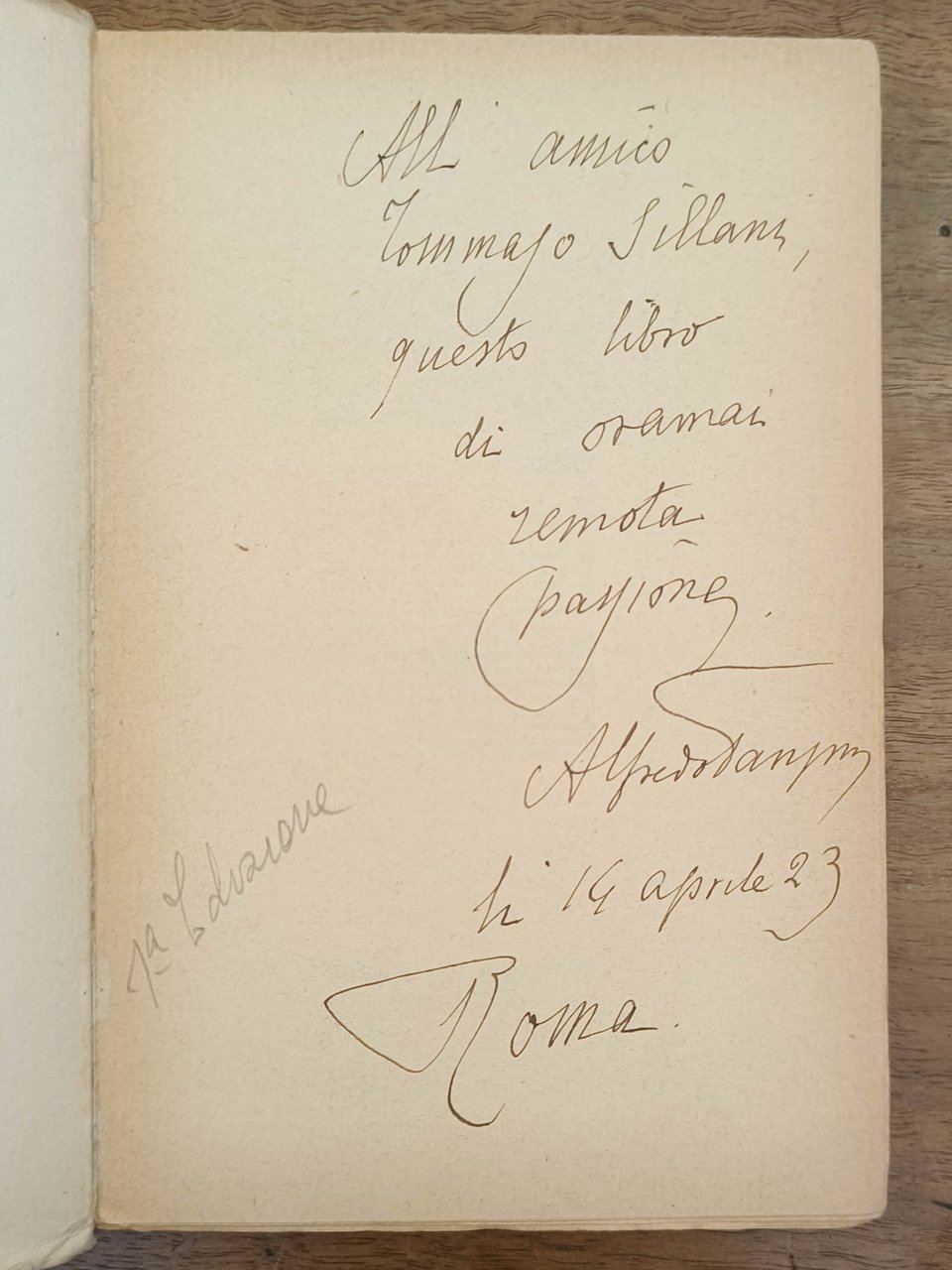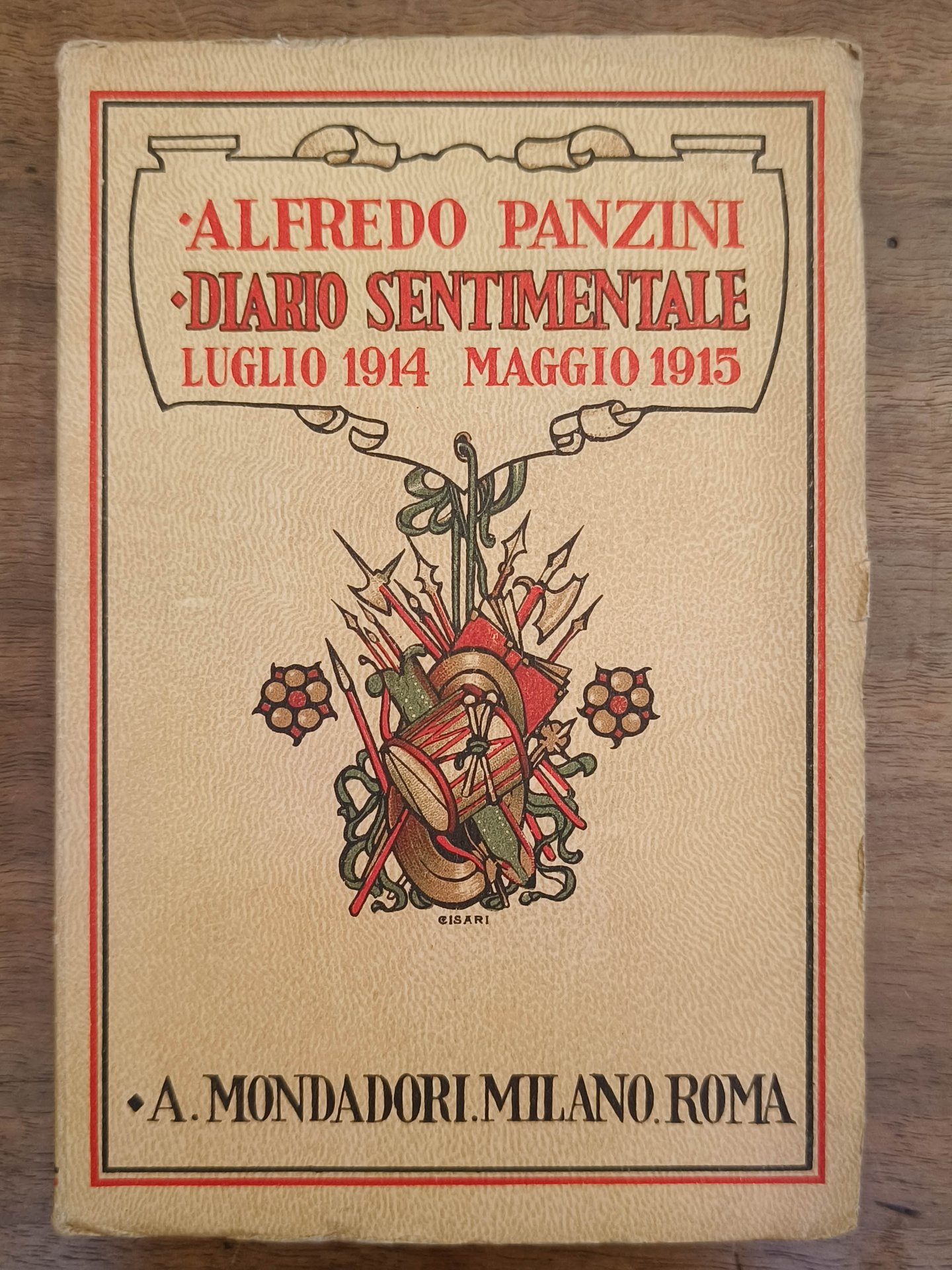 Diario sentimentale. Luglio 1914 maggio 1915, Milano-Roma, Mondadori, 1923. Prima edizione. Cm 18,7. Pp. 225. Brossura editoriale illustrata. Pagine chiuse. Dedica dell'autore all'antiporta. "All'amico Tommaso Sillani, questo libro di oramai remota passione. Alfredo Panzini li 14 aprile 23 Roma".