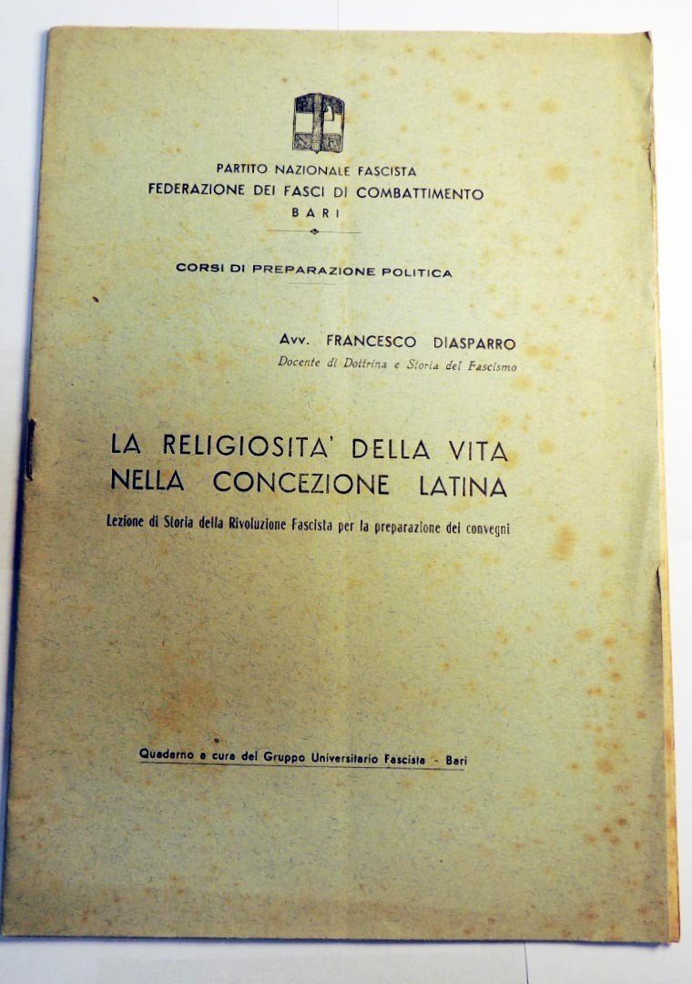 Francesco Diasparro, la religiosità della vita nella concezione latina. Lezione di Storia della Rivoluzione Fascista per la preparazione dei convegni, Tip. Romana, Bari s.d. (ma 194?), pp. 18, cm 25. In testa al frontespizio: Partito Nazionale Fascista – Federazione dei Fasci di Combattimento – Bari, Corsi di preparazione politica. In calce al frontespizio: Quaderno a cura del Gruppo Universitario Fascista – Bari. Qualche fioritura, per il resto buon esemplare. Estremamente raro.