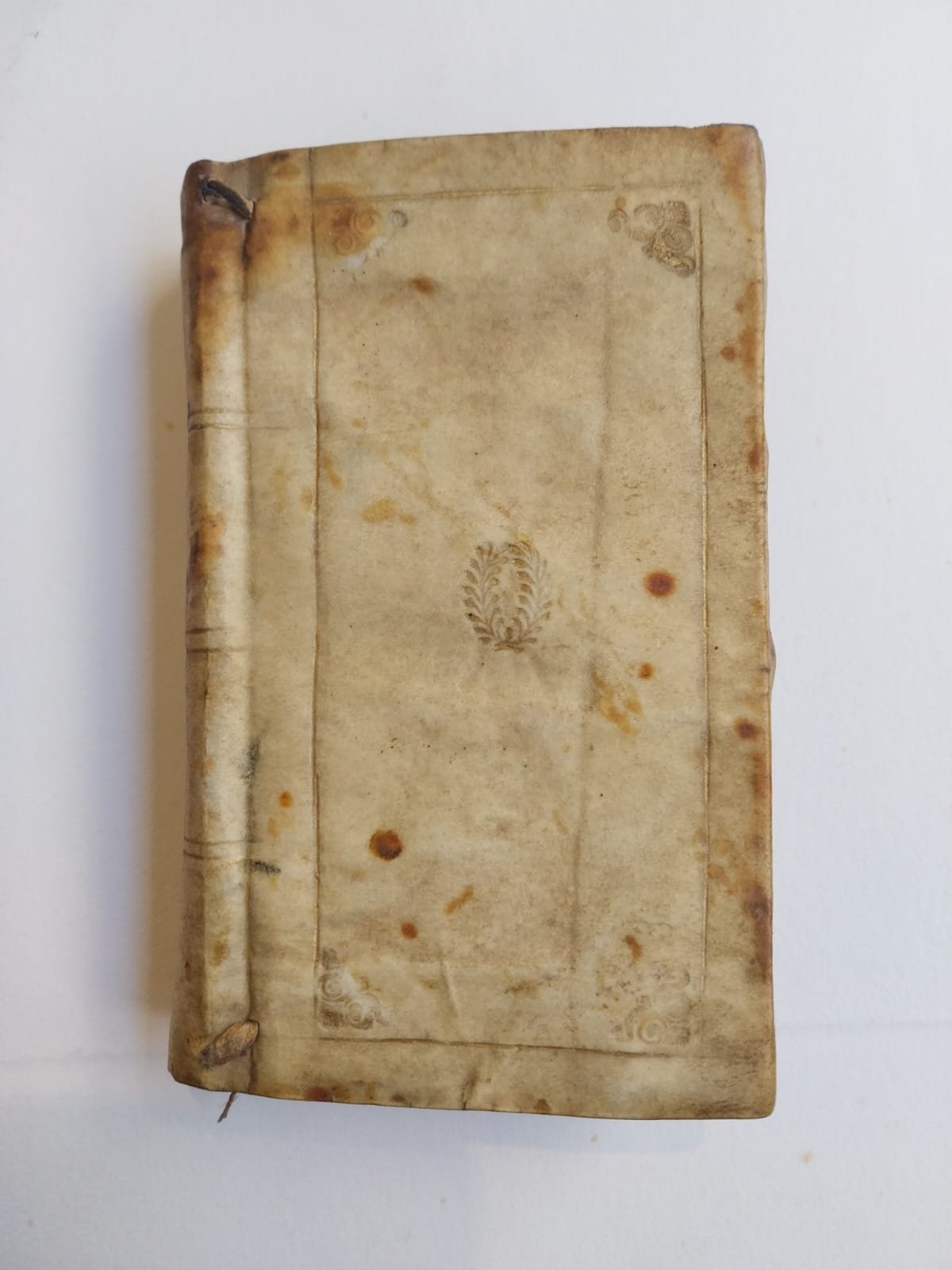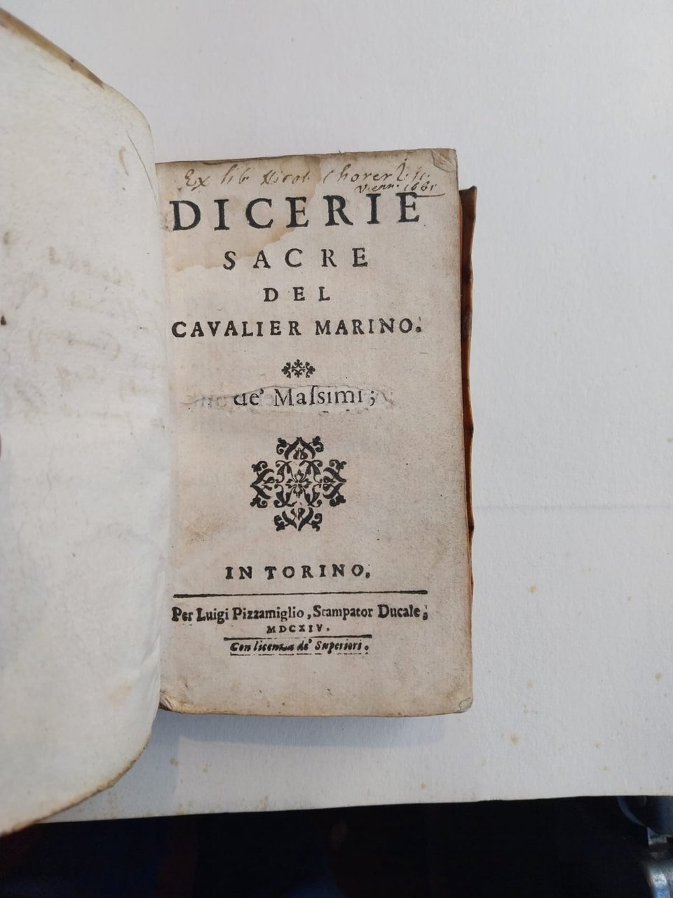 In-12° (140x85 mm), cc. (12), 268, legatura coeva piena pergamena semifloscia con unghiature, ai piatti cornice lineare in oro con fregi geometrici ai piccoli ferri agli angoli e al centro, titolo manoscritto al dorso, tagli rossi. Fregio xilografico al titolo, fregi e capilettera in xilografia. Al frontespizio è stata asportata la scritta volume primo. Affascinante e genuino esemplare. Prima edizione, molto rara, del primo volume (ed unico pubblicato dal torinese Pizzamiglio) di queste famose prose sacre del Marino. La prima diceria, dedicata a Carlo Emanuele di Savoia, è la La Pittura sopra la Santa Sindone, e consiste in una lunga predica intorno al sacro lenzuolo; la seconda, dedicata al Cardinal Maurizio di Savoia, sintitola La Musica, sopra le sette parole dette da Christo in croce e contiene sparse osservazioni musicali; la terza, infine, è dedicata al Principe di Piemonte e reca il titolo Il Cielo, sopra la religione de santi Mauritio et Lazaro. Cat. Vinciana, n. 3453. Cicognara, 166. Olschki, Choix, 11098: Premiere edition fort rare. Manca al Parenti, Prime edizioni italiane.