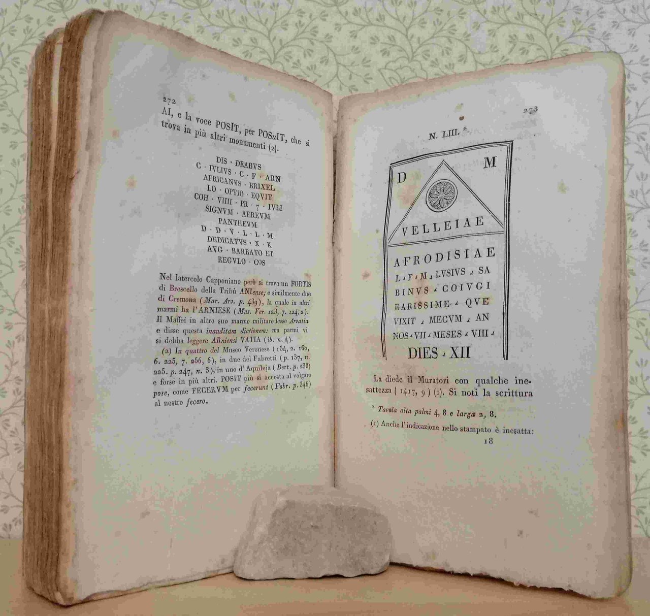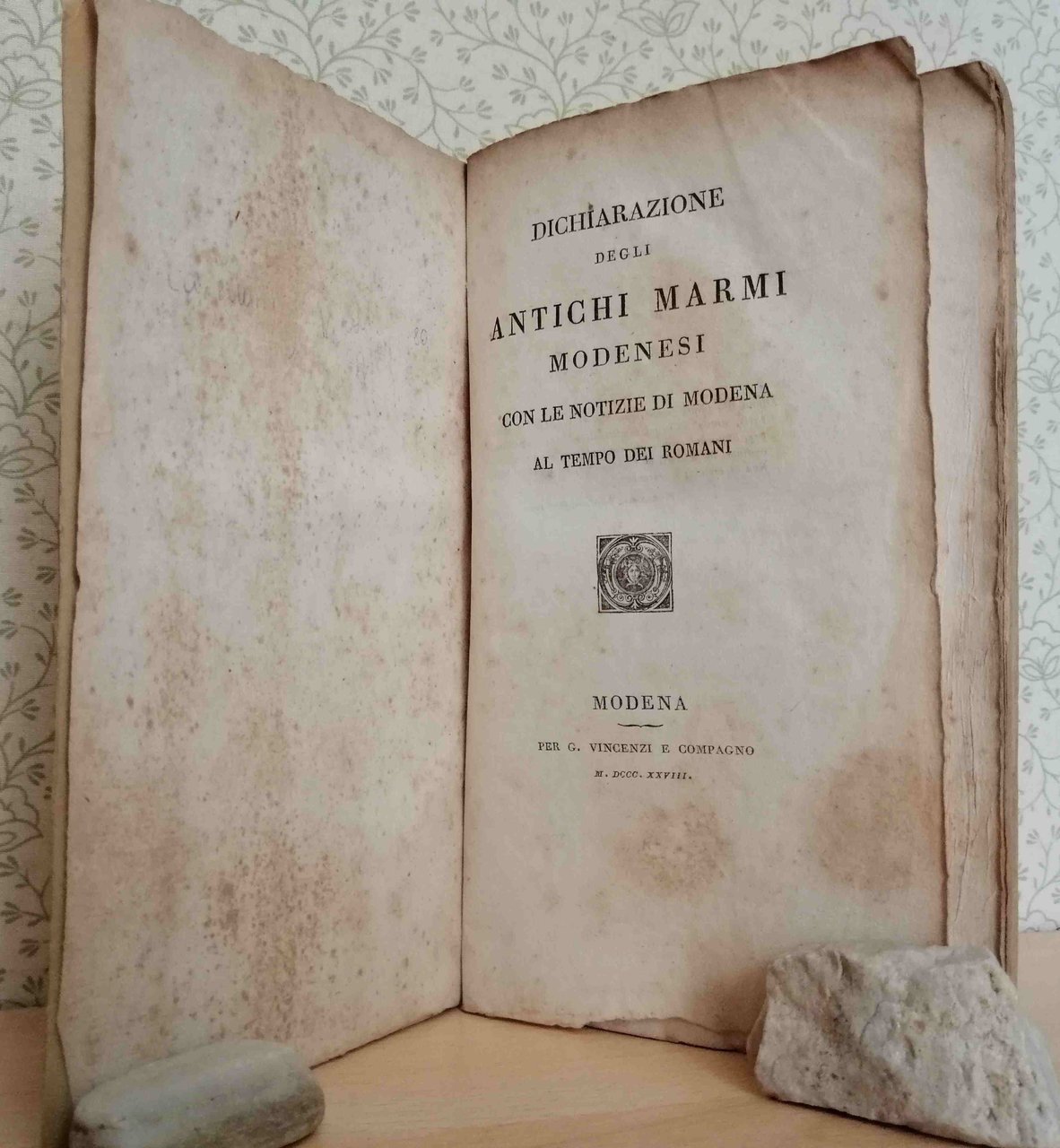 Volume in 8, brossura editoriale rinforzata al piatto anteriore, sguardie, frontespizio, XI, 316 pp, 2 tavole ft. incise in rame pi volte ripiegate. Prima interessantissima edizione di quest'opera sulle epigrafi modenesi redatta dal noto studioso e ricercatore sotto la spinta della rinascente voglia di conoscenza delle radici romane e latine tipica della prima met del XIX secolo, tempo di principi che erano o si atteggiavano a mecenati della cultura. Libro prezioso per la conoscenza delle pietre incise che si trovano a Modena, intrecciato con la storia antica della citt ed arricchito dalle tavole in rame. Il volume in bello stato, ancora in barbe, qualche macchietta e fioritura dovuta al tipo di carta, molte vignette nel testo. Non facilmente reperibile.
