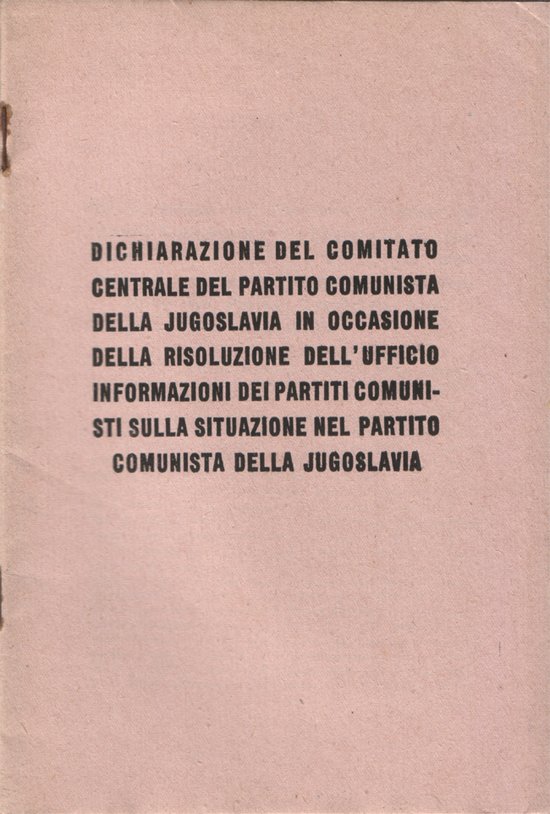 In-8°, pp. 32, copertina editoriale con graffette arrugginite. Buon esemplare. Edizione della Direzione per le informazioni presso la Presidenza del Governo della Repubblica popolare federativa di Jugoslavia. Contiene: Dichiarazione del Comitato Centrale del Partito Comunista della Jugoslavia in occasione della risoluzione dell' ufficio informazioni dei Partiti Comunisti sulla situazione nel Partito Comunista della Jugoslavia; Dichiarazione del C. C. del P. C. J. del 20 giugno 1948 indirizzata alla Sessione dell'Ufficio Informazioni; Decisione del Comitato Centrale del Partito Comunista della Jugoslavia sull'espulsione di Andrija Hebrang e Sreten Zujovic dal Partito Comunista della Jugoslavia; Allegato. Decisione dell'Ufficio Politico del P. C. J. sul caso di Andrija Hebrang e Sreten Zujovic del 19. IV. 1946; Risposta ai compagni bulgari.