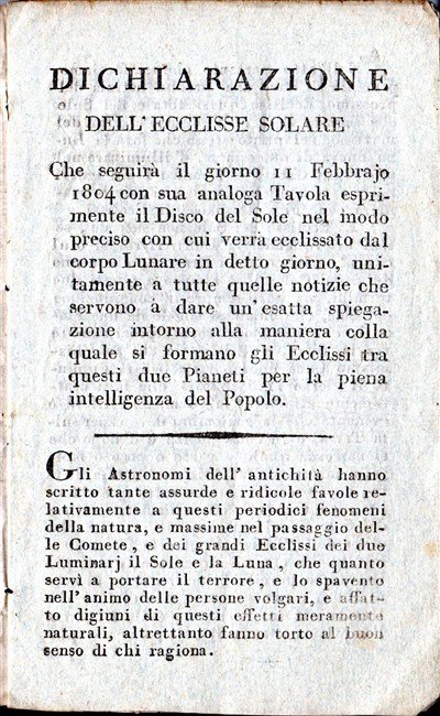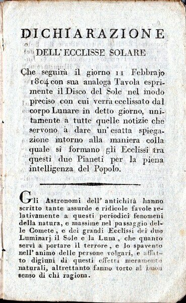 DICHIARAZIONE DELL'ECCLISSE SOLARE che seguirà il giorno 11 Febbrajo 1804.