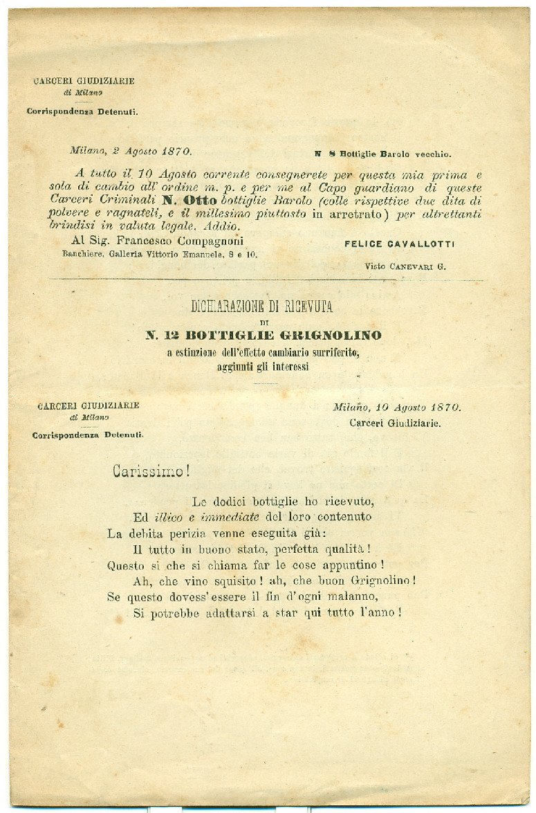 Foglio volante di p. 4 non numerate. - Parenti, Rarità, VI, p. 184: «Una di quelle scherzose fu stampata su un quarticino… è riprodotta la intestazione della carta delle Carceri Giudiziarie…. pubblicata dal banchiere Francesco Compagnoni, amico del Cavallotti.».