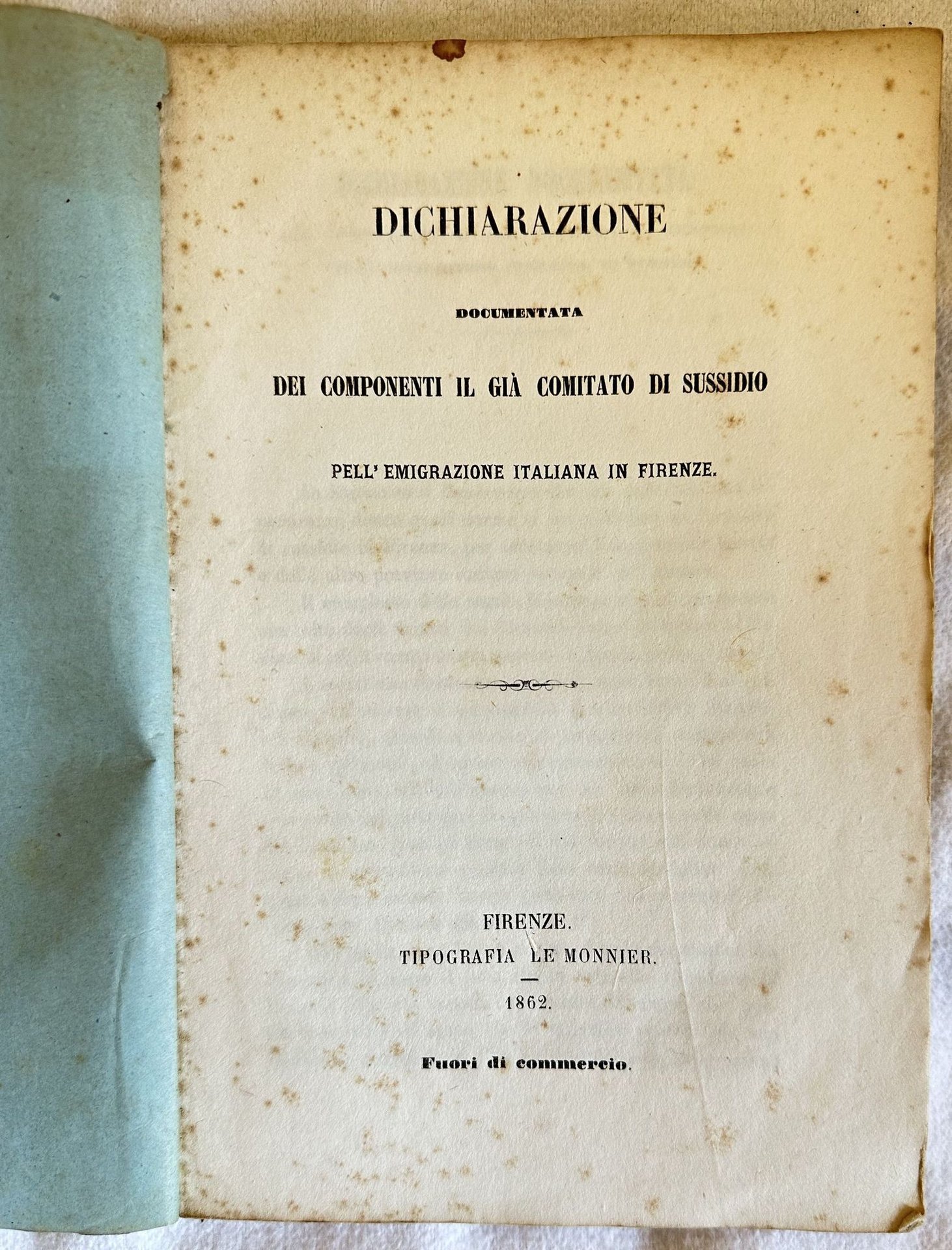 DICHIARAZIONE DOCUMENTATA DEI COMPONENTI IL GIA COMITATO DI SUSSIDIO DELL'EMIGRAZIONE ITALIANA IN FIRENZE