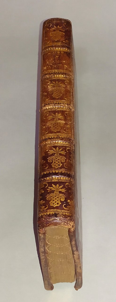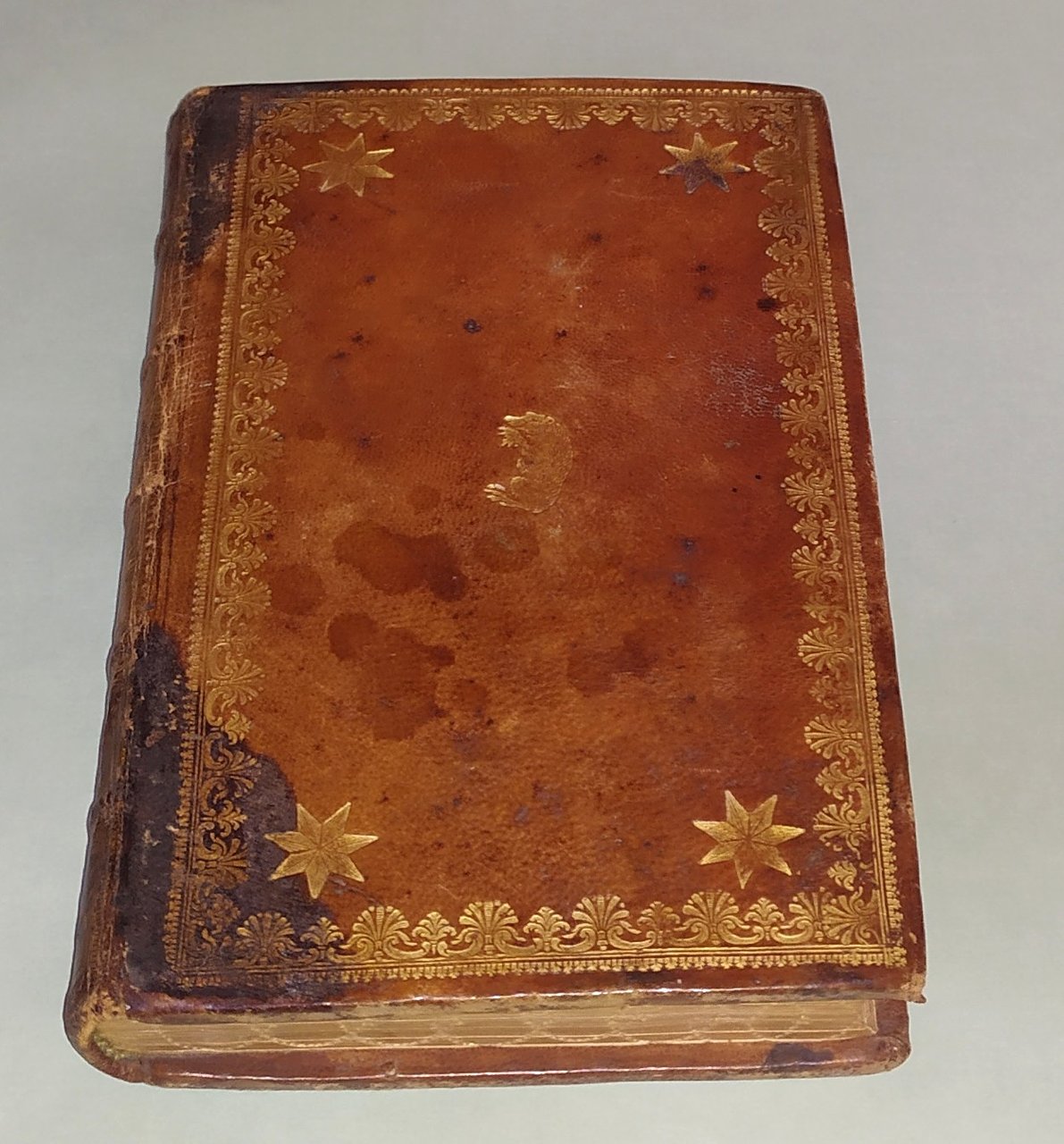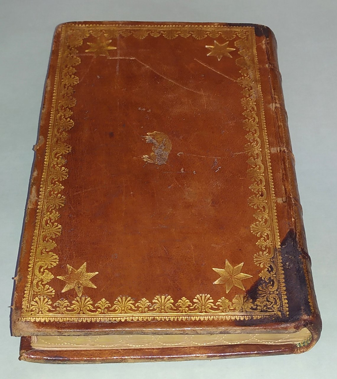 CHERUBINO Fr. Dichiarazione istorica teologica dell'Anno Santo scritta da Fr. Cherubino da Roma divisa in tre libri. In Roma, Salomoni,1750. In 8vo (cm.21x14); pp.16n.nn., 254, 1n.n. Stemma al frontespizio, antiporta illustrata con il ritratto di Benedetto XIV. Testate, capilettera e finaletti incisi. Legatura in cuoio avana del secolo decimottavo. Fregio dorato inquadra un orso, simbolo dello stemma di Casa Orsini. Stelle dorate agli angoli dei piatti. Tracce d'umido alle cerniere. Cm.21x14.