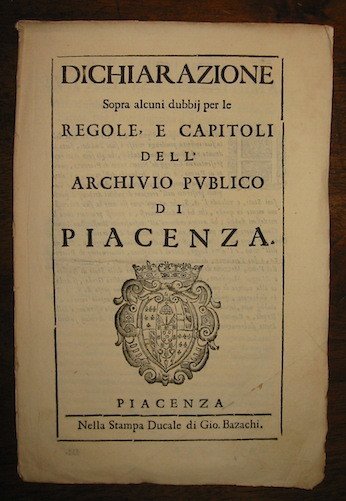 Dichiarazione sopra alcuni dubbij per le Regole, e Capitoli dell’Archivio Publico di Piacenza