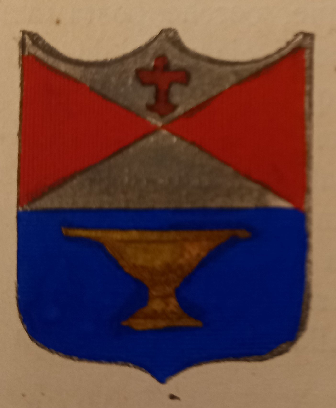 Piccolo stemma comunale colorato a mano d’epoca (cm. 3,8 x 3,2 ca.). Stralcio dal Dizionario Corografico illustrato dell’Italia, edito a Milano nel 1868. Ogni stemma di questa raccolta è inserito in una o più pagine di testo con la descrizione della località, notizie storico - geografiche e statistiche (numero degli abitanti e degli elettori, guarnigioni della Guardia Nazionale, ecc.). Spesso il testo è redatto da studiosi locali o dai sindaci, con maggiori, interessanti notizie.